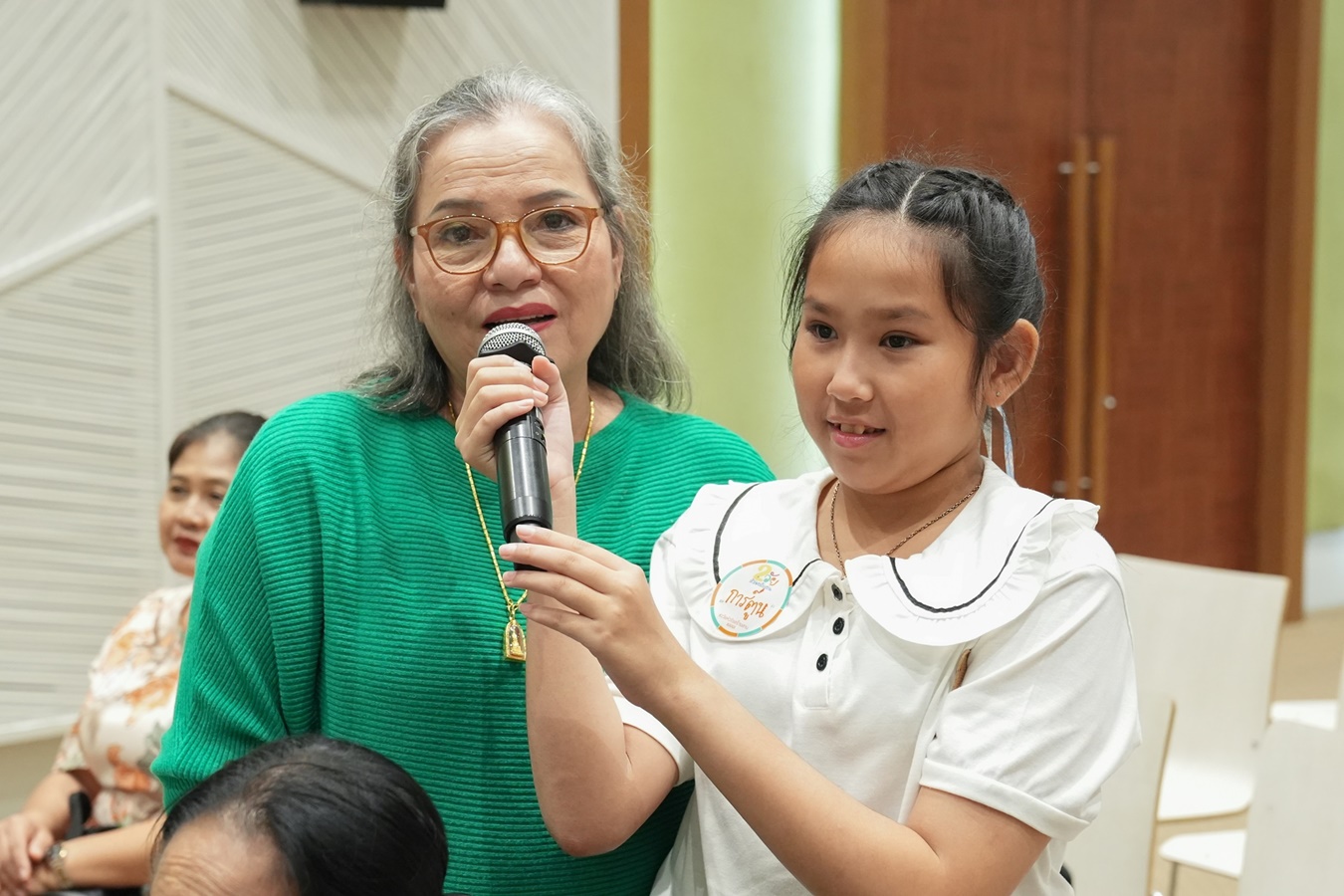 ด้าน ป้าเนาว์ เนาวรัตน์ กล่าวถึงการมาร่วมกิจกรรมในครั้งนี้ว่า … “ดีใจมาก เป็นเกียรติที่สุด ที่ได้มาร่วมโครงการ “2 วัย หัวใจสร้างสาน” เพราะเป็นโครงการดี ๆ ที่สามารถช่วยทำให้ คน 2 วัย มีความเข้าใจและไปด้วยกันได้ถ้าจูนติดกัน ก็จะแฮปปี้มาก ซึ่งคิดว่าจุดสำคัญที่ทำให้เกิดช่องว่างระหว่างวัย คือ ความไม่เข้าใจกัน อยากให้เชื่อมกัน อยากให้หันมารักกัน กอดกัน จะได้ เข้าใจกัน พอหลังจากได้ดูคลิปบางส่วนที่นำมาเปิดในวันนี้ บอกเลยว่า… ซึ้งมาก ได้เห็นถึงความพยายามของหลาน ๆ ที่ชวนคุณปู่ คุณย่า คุณตา คุณยาย มาทำคลิป มาทำกิจกรรมร่วมกัน ดูแล้วมีความสุขมาก ๆ เลยค่ะ ส่วนตัวอยากให้มีโครงการฯนี้ ต่อไปเรื่อย ๆ นะคะ”
