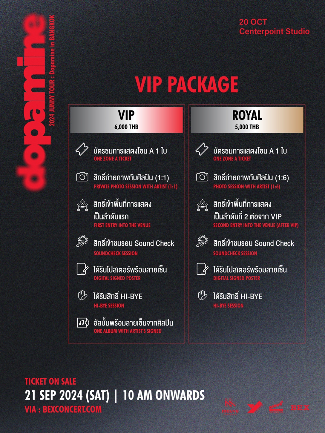 - VIP ticket  6,000 THB : Includes a private photo session 1:1, an album with artist’s signature, a soundcheck session, hi-bye session and an official poster with artist’s digital signature.