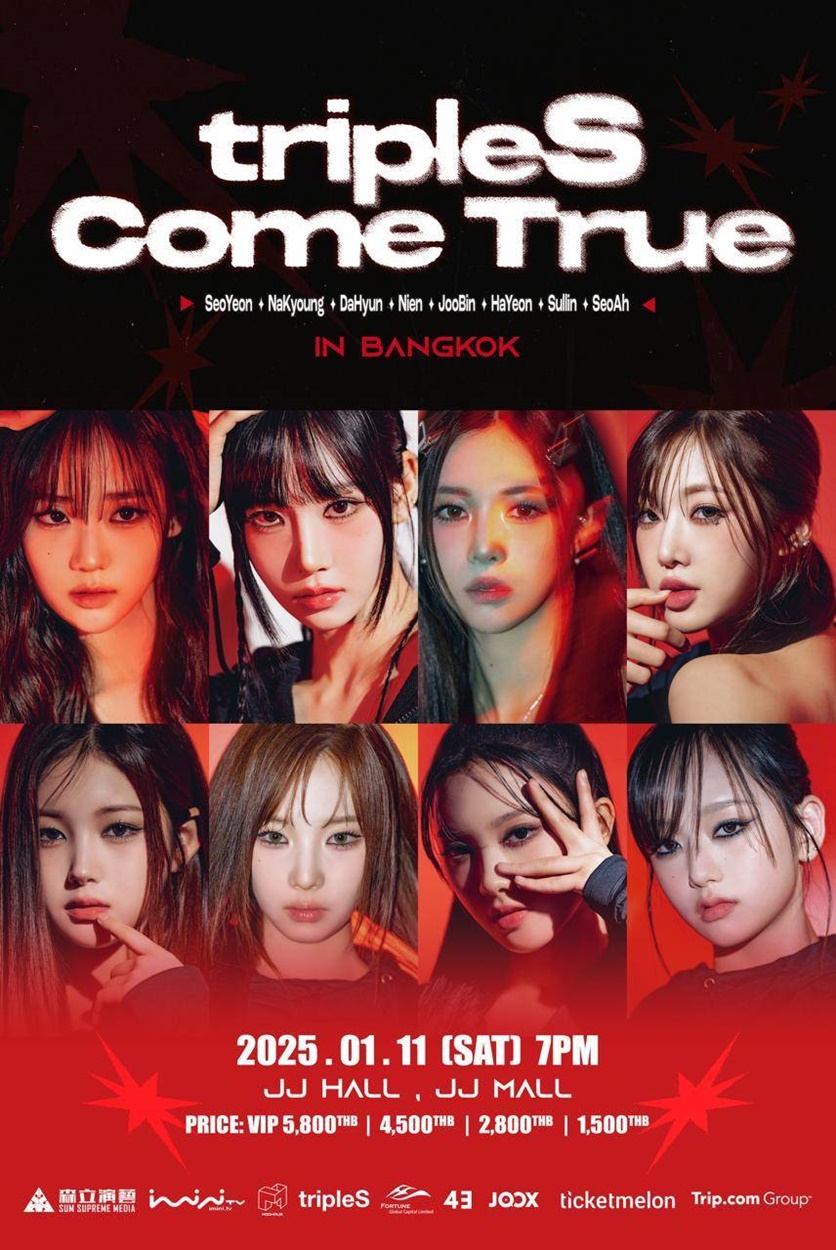“tripleS Come True” World Tour in Bangkok จะมีเวิลด์ทัวร์ที่ประเทศไทยเป็นที่แรก และจะจัดขึ้นในวันเสาร์ที่ 11 มกราคม 2568 ที่ JJ Hall, JJ Mall เตรียมเปิดจำหน่ายบัตรในวันศุกร์ที่ 6 ธันวาคม 2567 ทาง www.ticketmelon.com บัตรราคา VIP 5,800 บาท , ZONE A 4,500 บาท , ZONE B 2,800 บาท และ ZONE C 1,500 บาท