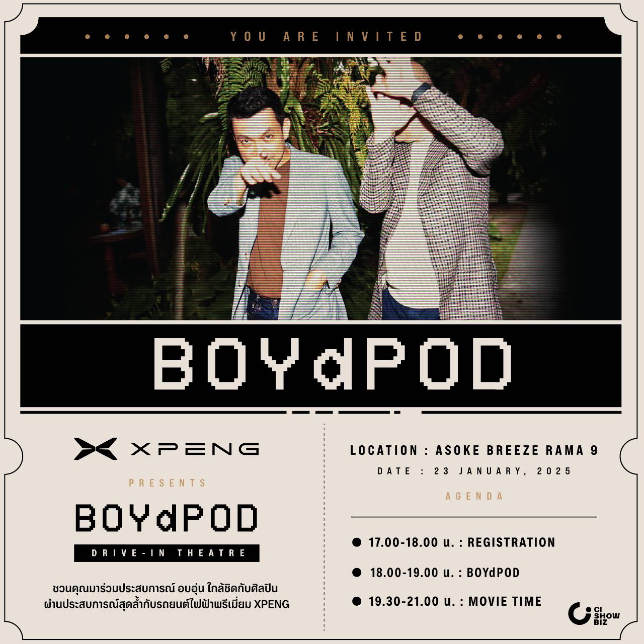 XPENG presents BOYdPOD Drive -in Theatre ครั้งแรกสำหรับการแสดงสด บทเพลงใหม่ จาก อัลบั้ม BOYdPOD OST ในรูปแบบ Drive -in Theatre ใจกลางเมือง ในวันพฤหัสบดีที่ 23 มกราคม 2568 ณ Asoke Breeze เวลา 17.00-21.00 น.