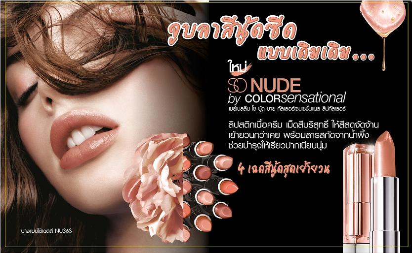 เมย์เบลลีน โซ นู้ด บาย คัลเลอร์เซนเซชั่นแนลลิปสติกคอลเลคชั่นใหม่ล่าสุด ที่มาพร้อมนิยามใหม่ของลิปสติกสีนู้ด จากโทนสีสุดเรียบแบบเดิมๆ ที่หลายคนเชื่อว่ามักทำให้ใบหน้าดูซีดเซียว มาเป็นลิปสติกสีนู้ดที่ดึงดูดทุกสายตาดั่งต้องมนต์สะกด ด้วยอณูเม็ดสีคมชัด และส่วนผสมของสารสกัดจากน้ำผึ้งบริสุทธิ์จากเกสรดอกไม้ ทำให้สีบนเรียวปากสวยชัดสม่ำเสมอ หมดปัญหาปากแห้งเป็นคราบ หรือสีลิปสติกตกร่องลืมไปเลยสีนู้ดเดิมๆ ไร้ชีวิตชีวา