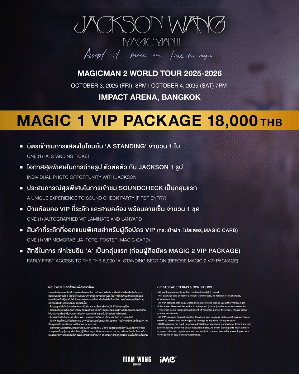 ถึงเวลารีเช็คความพร้อม!?! กับปรากฏการณ์ครั้งใหม่ที่แฟนๆ รอคอย “MAGIC MAN IS BACK!!” การกลับมาอย่างยิ่งใหญ่ของจักรวาล MAGICMAN 2 พร้อมเปิดฉากความมันส์ให้เดือดระอุกับ ‘เมจิกแมน’ สุดเท่ “แจ็คสัน หวัง” (Jackson Wang) หรือที่แฟนคลับชาวไทยเรียกกันอย่างเอ็นดูว่า “พี่แจ็ค” ครั้งนี้เขากลับมาพร้อมเวิลด์ทัวร์คอนเสิร์ตใหญ่เต็มรูปแบบ และโชว์ที่ยกระดับทั้งด้านโปรดักชันและพลังการแสดงให้เหนือกว่าทุกครั้งที่ผ่านมา สำหรับเวิลด์ทัวร์ MAGICMAN 2 ครั้งนี้เปิดฉากด้วย 6 เมือง ประเดิมประเทศไทยเป็นเมืองแรก ก่อนจะเดินทางต่อไปยัง มาเก๊า, จาการ์ตา, กัวลาลัมเปอร์, มะนิลา และโตเกียว พร้อมประกาศเมืองเพิ่มเติมอีกเร็ว ๆ นี้ ซึ่งแน่นอนว่าแฟน ๆ ชาวไทยเตรียมตัวให้พร้อมกับงาน MAGICMAN 2 WORLD TOUR 2025-2026 in Bangkok Presented by Galaxy Resorts Thailand กันได้เลย งานนี้จัดเต็ม 2 รอบการแสดงสุดยิ่งใหญ่ ในวันศุกร์ที่ 3 ตุลาคม 2568 เวลา 20.00 น. และวันเสาร์ที่ 4 ตุลาคม 2568 เวลา 19.00 น. ณ อิมแพ็ค อารีน่า เมืองทองธานี โดยผู้จัด iMe Thailand ทุ่มทุนสร้างโปรดักชั่นระดับโลกที่ผู้ชมจะลืมไม่ลง