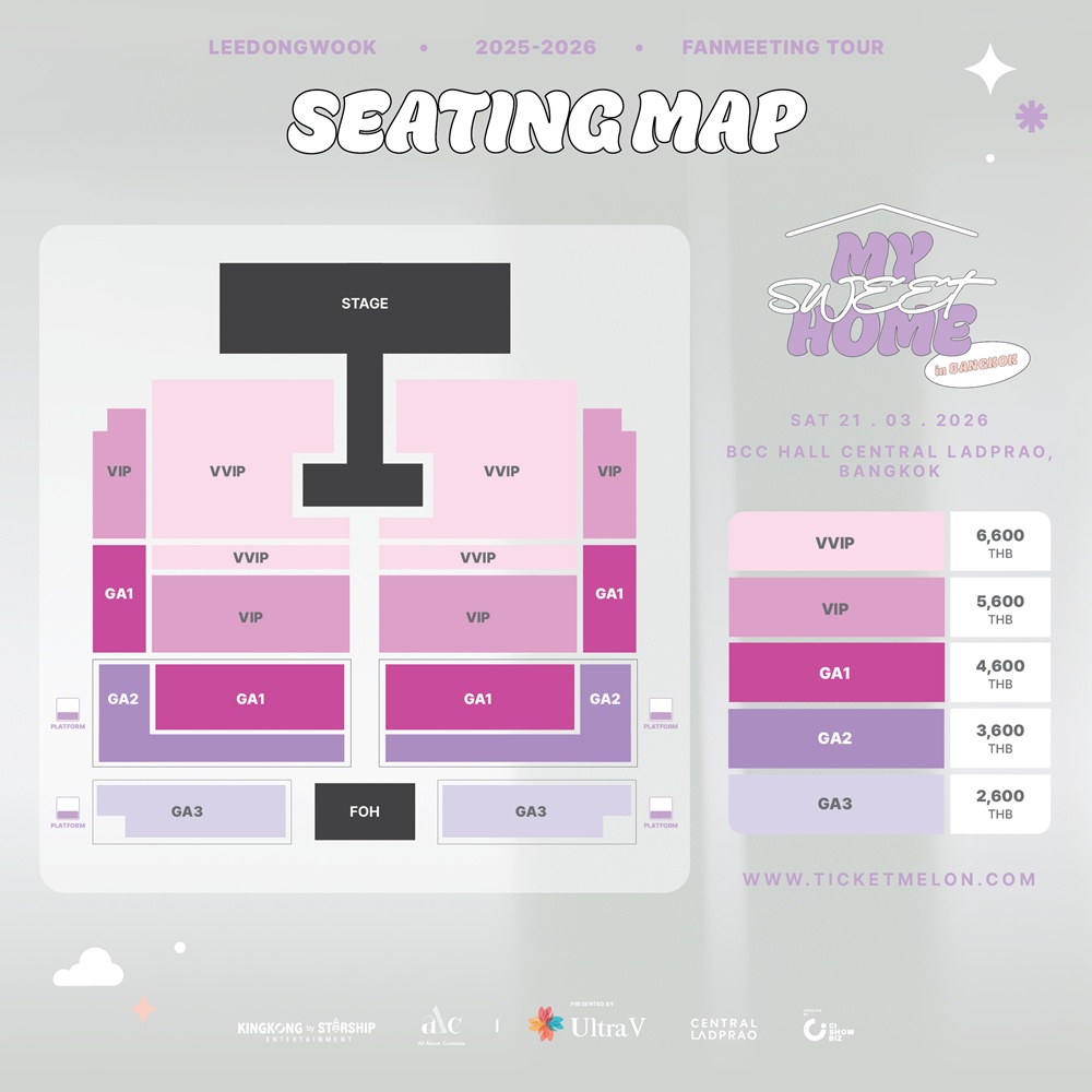 ส่วนผังที่นั่ง และราคาบัตร แบ่งออกเป็น 5 โซน ได้แก่ VVIP ราคา 6,600 บาท / VIP ราคา 5,600 บาท/ GA1 ราคา 4,600 บาท / GA2 ราคา 3,600 บาท และ GA3 ราคา 2,600 บาท ในราคาที่คุ้มค่าเพื่อตอบโจทย์ทุกระดับความใกล้ชิด ให้neoheeไทยได้ดื่มด่ำกับความฟิน ภายใต้คอนเซ็ปต์ “My Sweet Home” อย่างเต็มที่ พร้อมกับสิทธิพิเศษมากมายแบบอัดแน่น เช่น Mini Talk, Hi-Bye, Hi-Touch, Group Photo, Signed Polaroid, Signed Poster, Photo Card และ Official Poster