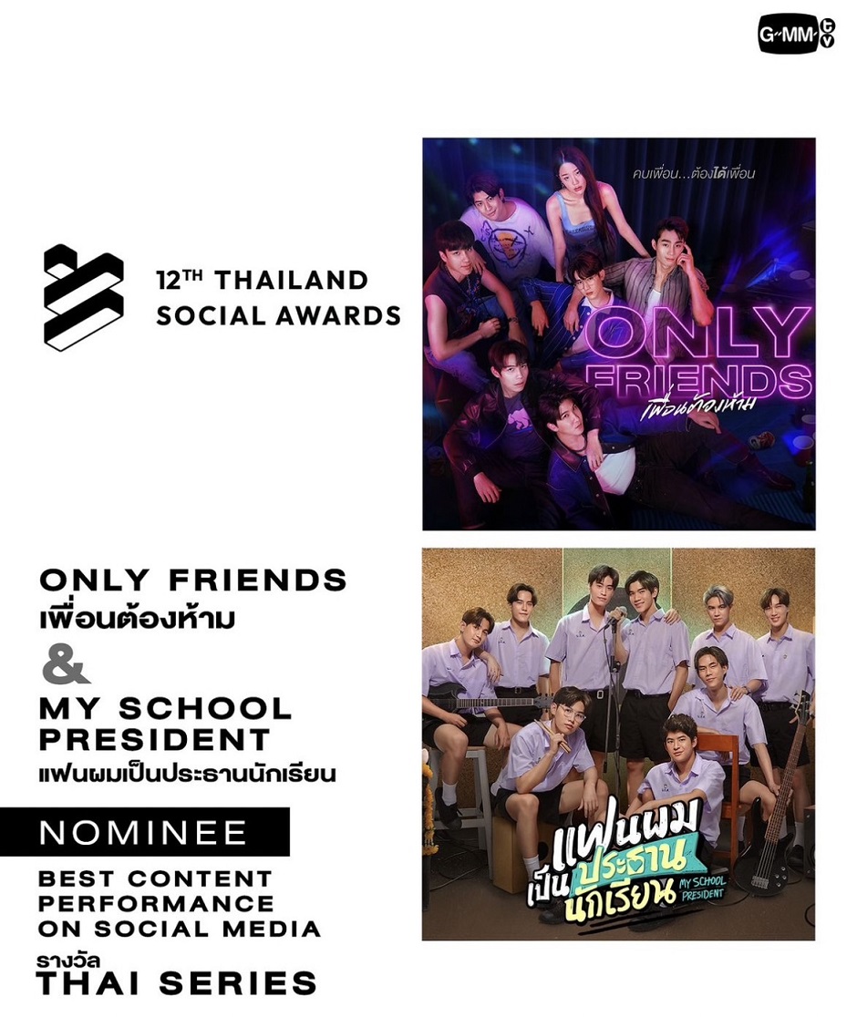ฟากผลงานจาก GMMTV บริษัทในกลุ่ม “เดอะ วัน เอ็นเตอร์ ไพรส์” ที่สามารถคว้ารางวัลFinalist กลุ่มรางวัลประเภท Best Content Performance on Social Media สาขา Thai Series ได้อีก 2 รางวัล ได้แก่ ซีรีส์ “Only Friends เพื่อนต้องห้าม” และซีรีส์ “My School President แฟนผมเป็นประธานนักเรียน” ที่ออกอากาศทางช่องGMM25