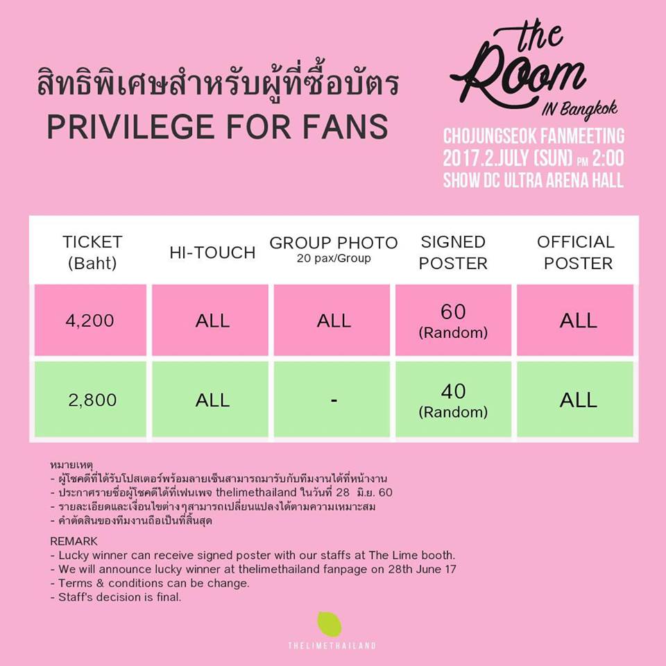 อยากสัมผัสกับความน่ารักเป็นกันเองของหนุ่มโจจองซอกอย่างใกล้ชิด ต้องไม่พลาด กับงาน “2017 CHO JUNG SEOK FANMEETING in Bangkok <The Room>” ที่จะจัดขึ้นในวันที่ 2 กรกฎาคม 2560 ที่ Ultra Arena Hall @ Show DC ราคาบัตร 4,200 และ 2,800 บาท รับสิทธิไฮทัชทุกที่นั่งพร้อมสิทธิพิเศษอื่นๆ มากมาย มาเจอกันให้ได้นะคะ รับรองหนุ่มโจจองซอกมีเซอร์ไพรส์ดีๆถูกใจแฟนๆ แน่นอน ติดตามรายละเอียดเพิ่มเติมจากผู้จัดใจดี The Lime Thailand ได้ที่ www.Thelimethailand.com,Facebook และTwitter : Thelimethailand