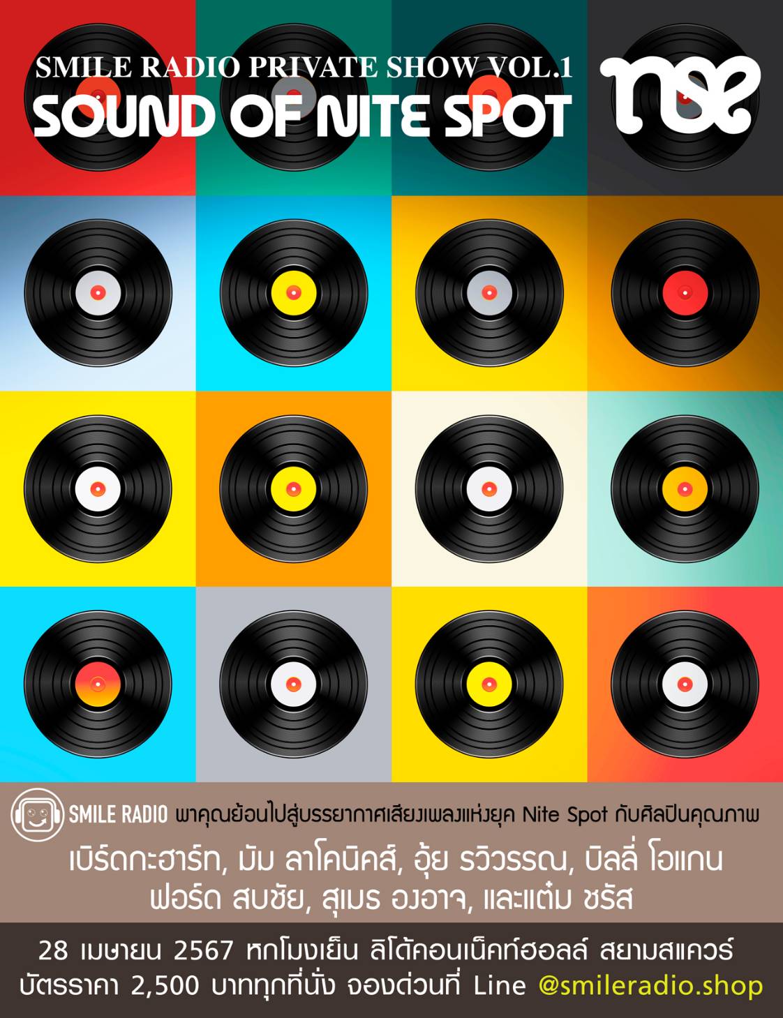 คอนเสิร์ต Smile Radio Private Show ครั้งที่ 1 ตอน “The Sound of Nite Spot” จะจัดขึ้นแบบอบอุ่นเพียง 300 ที่นั่ง เสมือนเป็นโชว์ส่วนตัวที่ผู้ชมจะได้สนุก ได้ซึ้ง และร้องตามไปกับบทเพลงในความทรงจำมากมายที่ถ่ายทอดโดยศิลปินทั้งรุ่นพี่รุ่นน้องอย่าง เบิร์ดกะฮาร์ท, มัม ลาโคนิคส์, อุ้ย รวิวรรณ, บิลลี่ โอแกน, ฟอร์ด สบชัย, สุเมธ องอาจ, และแต๋ม ชรัส
