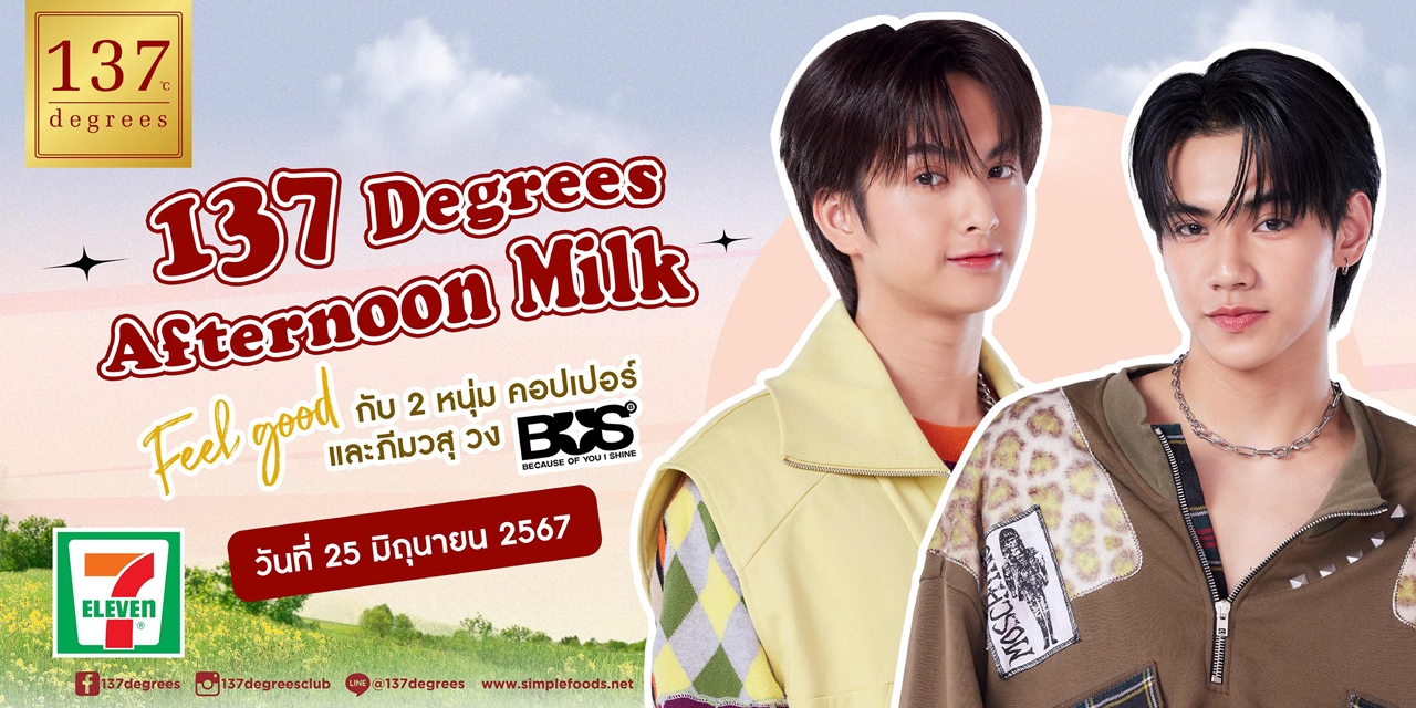 137 ดีกรี® สร้างปรากฏการณ์เอาใจแฟนคลับวง BUS จับกระแส T-POP จัดแคมเปญ “137 Degrees Afternoon Milk x BUS” จิบนมยามบ่ายกับสองหนุ่ม “ภีมวสุและคอปเปอร์” แบบใกล้ชิด พร้อมรับของขวัญสุดพิเศษ เอ็กซ์คลูซีฟเฉพาะ 50 ลักกี้แฟน ที่ช้อปสินค้าที่ร้าน 7-Eleven เริ่ม 1-31 พฤษภาคม 2567 นี้เท่านั้น