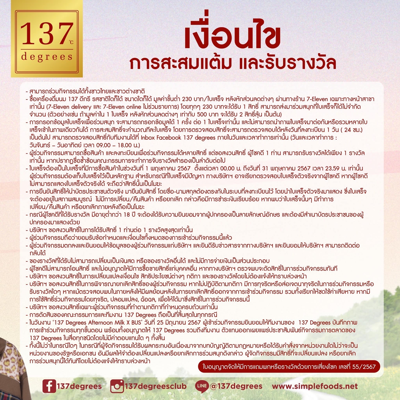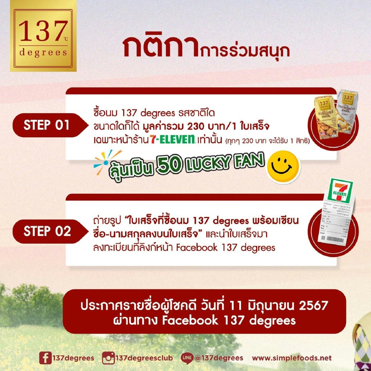 1. ซื้อนม 137 Degrees รสชาติใดก็ได้ มูลค่ารวม 230 บาทต่อ 1 ใบเสร็จ ตั้งแต่วันที่ 1 พฤษภาคม 2567 – 31 พฤษภาคม 2567 ที่ร้าน 7-Eleven เฉพาะหน้าร้านเท่านั้น (7-Eleven delivery และ 7-Eleven online ไม่ร่วมรายการ)