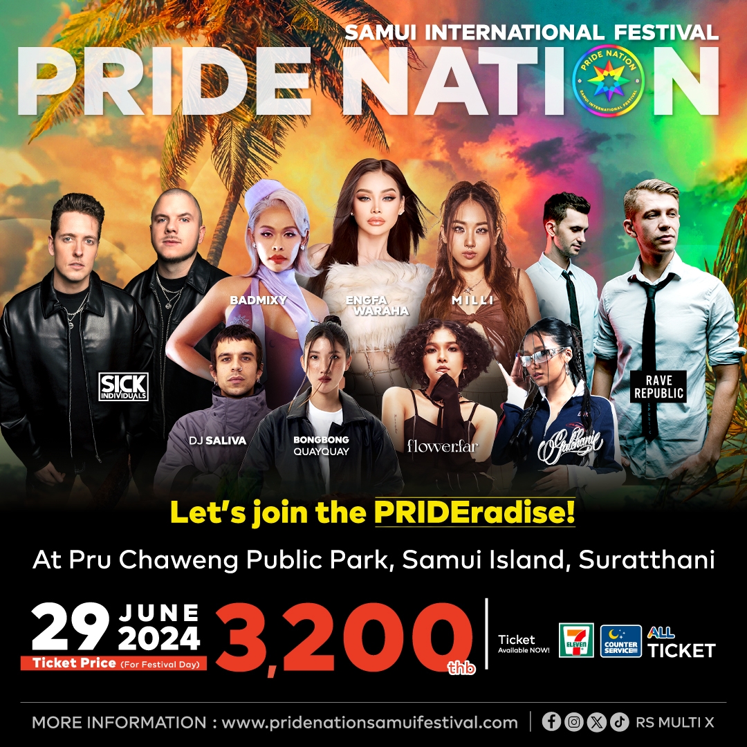 วันที่ 16 พฤษภาคมที่ผ่านมา อาร์เอส มัลติเอ็กซ์ ภายใต้ บริษัท อาร์เอส มัลติมีเดีย แอนด์ เอ็นเตอร์เทนเมนท์ จำกัด ในเครือ อาร์เอส กรุ๊ป พร้อมโบกสะบัดธงสีรุ้งอย่างเต็มภาคภูมิ จัดงานแถลงข่าวสุดยิ่งใหญ่ PRIDE NATION SAMUI INTERNATIONAL FESTIVAL โปรเจกต์ระดับอินเตอร์เนชั่นแนล ภายใต้คอนเซปต์ Let’s Join PRIDEradise สร้างยูนิตี้ (Unity) เปลี่ยนเกาะสมุยให้เป็นเกาะสวรรค์ สำหรับชาว LGBTQIAN+ แบบไร้เพศสภาพ พร้อมไฮไลท์เปิดตัวศิลปิน อิงฟ้า วราหะ, มิลลิ (MILLI) แร็ปเปอร์สาวสุดฮอต,  Badmixy มิกซ์ เฉลิมศรี ที่จะขนจักรวาลพวกพ้อง LGBTQIAN+ เข้ามาร่วมสร้างโชว์สุดยิ่งใหญ่แบบที่ไม่เคยได้เห็นที่ไหนมาก่อน โดยงานแถลงข่าวครั้งนี้ได้จำลองความสนุกที่จะเกิดขึ้นในเกาะสมุยมาตั้งไว้ใจกลางเมืองกรุงเทพฯ ณ ลานอีเดน ชั้น 1 ศูนย์การค้าเซ็นทรัลเวิลด์ ซึ่งโปรเจกต์ดังกล่าวจะเกิดขึ้นในวันที่ 24-29 มิถุนายน ปี 2567 ณ หาดเฉวง เกาะสมุย จังหวัดสุราษฎร์ธานี จัดเต็ม 6 วัน 6 คืน ส่งท้ายเทศกาลไพรด์ที่จัดจ้านที่สุดในภูมิภาคเอเชียตะวันออกเฉียงใต้ (Pride Nation is going to be THE MOST FABULOUS FESTIVAL FOR ALL PRIDE FIRST TIME IN SOUTHEAST ASIA) พร้อมวางเป้าหมายภายใน 5-6 ปี เป็น International PRIDE Community Hub ของภูมิภาคเอเชียตะวันออกเฉียงใต้