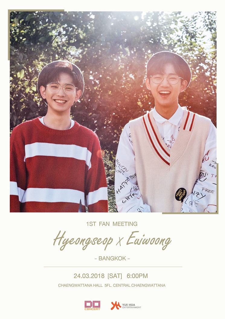 ฮยองซอบ และ อึยอุง สองหนุ่มน้อยน่ารักเอ็นดู จากรายการวาไรตี้ชื่อดัง Produce 101 Season 2 เตรียมเยือนไทยจัดงานแฟนมีตติ้ง ครั้งแรกในงาน HYEONGSEOP x EUIWOONG 1st Fan Meeting in Bangkok (ฮยองซอบxอึยอุง เฟิร์ส แฟนมีตติ้ง อิน แบงคอก) วันเสาร์ที่ 24 มีนาคม 2561 เวลา 6 โมงเย็น ณ แจ้งวัฒนะฮอลล์ เซ็นทรัลพลาซ่าแจ้งวัฒนะ โดยความร่วมมือกันระหว่าง Yue Hua Entertainment ประเทศเกาหลี และบริษัท ดูคอนเสิร์ต จำกัด