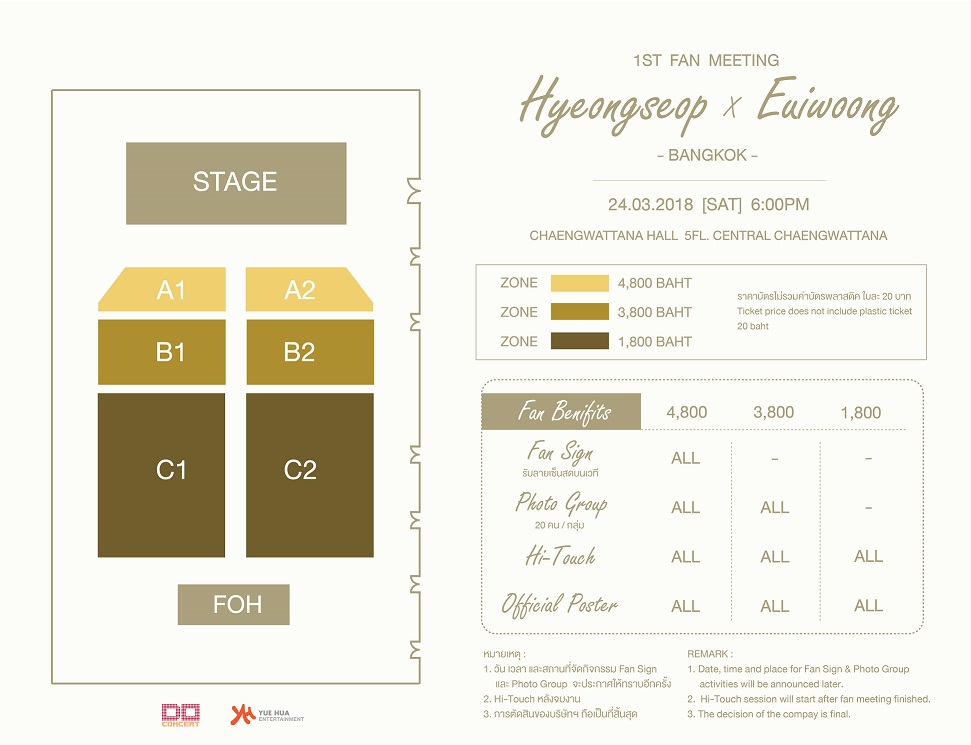 HYEONGSEOP x EUIWOONG 1st Fan Meeting in Bangkok (ฮยองซอบxอึยอุง เฟิร์ส แฟนมีตติ้ง อิน แบงคอก) พร้อมเปิดจำหน่ายบัตรวันเสาร์ที่ 3 กุมภาพันธ์ 2561 เวลา 10 โมงตรงทาง www.do-concert.com บัตรราคา 4,800 / 3,800 / 1,800 บาท พร้อมกับสิทธิพิเศษจัดเต็ม แจกไฮทัชทุกที่นั่ง! เพื่อให้ทุกคนที่มาร่วมงานได้สบ ตาสัมผัสมือสองหนุ่มน้อยอย่างใก ล้ชิด รวมถึงกิจกรรมแฟนไซน์ และถ่ายรูปกลุ่มที่มอบให้เป็นสิ ทธิพิเศษในแต่ละราคาอีกด้วย แฟนๆสามารถติดตามรายละเอียดสิท ธิพิเศษอื่นๆ และความเคลื่อนไหวของกิจกรรมที่ www.facebook.com/doconcert ทวิตเตอร์@doconcert อินสตาแกรม@doconcert_official