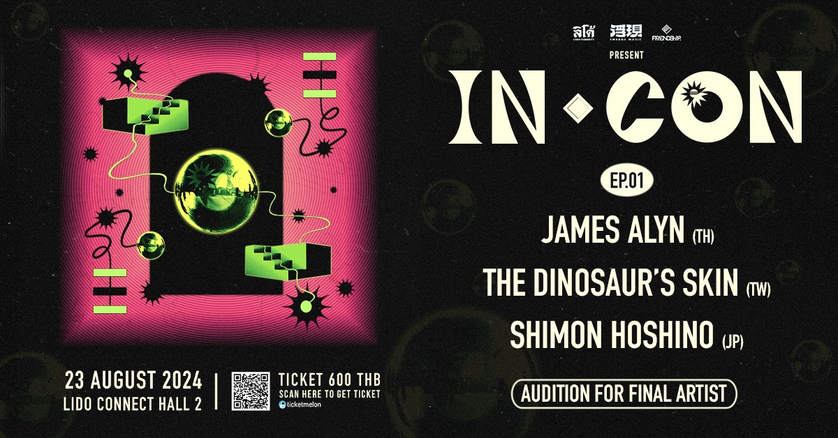 ‘IN CON’ Concert เกิดขึ้นจากความร่วมมือของ LIDO CONNECT ของ “จี๊บ – เทพอาจ กวินอนันต์” ที่มี “หญิง – พิรียา ถีระวัฒนาสวัสดิ์” นั่งแท่นบริหาร, Emerge Music และ FRIENDSHIP. ที่สร้างสรรค์และรวมศิลปินอินดี้จากทั้ง 3 ประเทศ มาบุกลิโด้ ในไลน์อัปที่หาที่ไหนไม่ได้อีกแน่นอน คือ “JAMES ALYN” จากประเทศไทย, “THE DINOSAUR’S SKIN” จากไต้หวัน และ “SHIMON HOSHINO” จากประเทศญี่ปุ่น พร้อมปลุกความเป็นอินดี้ในตัวคุณด้วยกัน ในวันที่ 23 สิงหาคม 2024 ณ LIDO CONNECT Hall 2