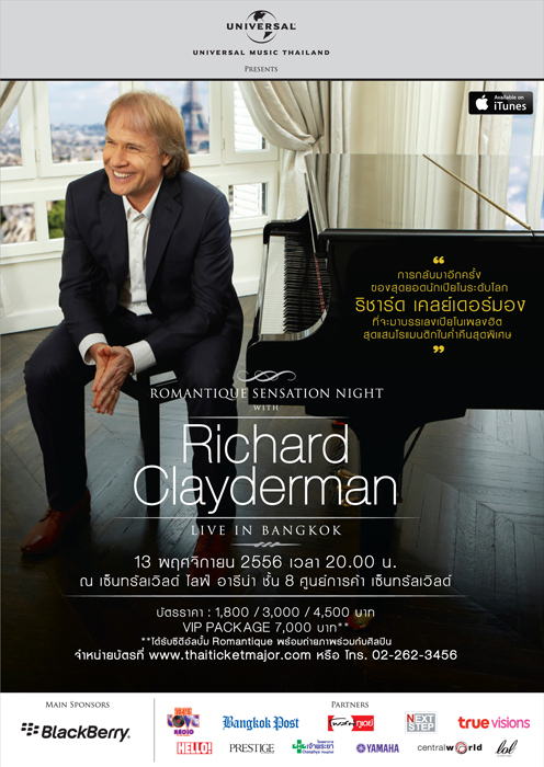 นับเป็นโอกาสพิเศษกับความโรแมนติก รับลมหนาวส่งท้ายปลายปี เมื่อ บริษัท ยูนิเวอร์ซัล มิวสิค (ประเทศไทย) จำกัด ค่ายเพลงชั้นนำของโลก ร่วมกับ“Blackberry” ภูมิใจนำเสนอโปรเจคสุดพิเศษกับค่ำคืนอันแสนโรแมนติกของRichard Clayderman (ริชาร์ด เคลย์เดอร์มอง)โรแมนติคเปียโนระดับโลกยอดขายอันดับ 1 ตลอดกาล ซึ่งครั้งนี้คุณจะได้ชมการแสดงเปียโนเพลงฮิตและหลากหลายบทเพลงที่หาฟังได้ยากจาก Richard Clayderman ใน “Romantique Sensation Night with Richard Clayderman” (โรแมนติก เซนเซชั่น ไนท์ วิท ริชาร์ด เคลย์เดอร์มอง)คอนเสิร์ตดีๆ ที่ทุกคนไม่ควรพลาดกับการร่วมสัมผัสประสบการณ์แสนหรูหราและน่าประทับใจในครั้งนี้