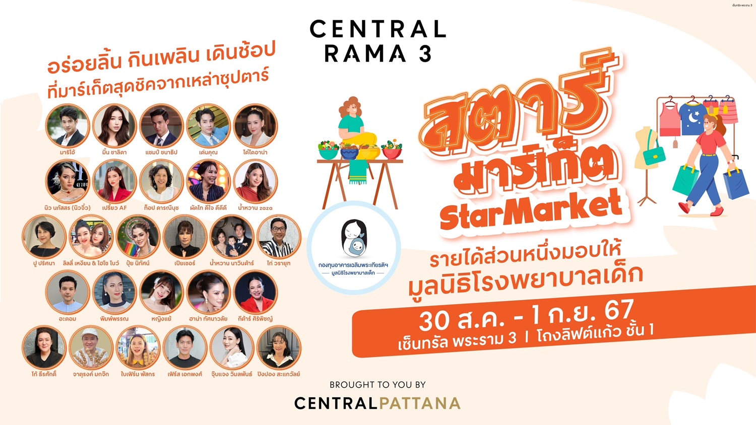 มากินเพลิน เดินช้อปกับ ตลาดดารา “Star Market” 30 ส.ค. 67 – 1 ก.ย. 67 บริเวณ โถงลิฟต์แก้ว ชั้น 1 เซ็นทรัล พระราม 3 หรือ สอบถามรายละเอียดเพิ่มเติมได้ที่
