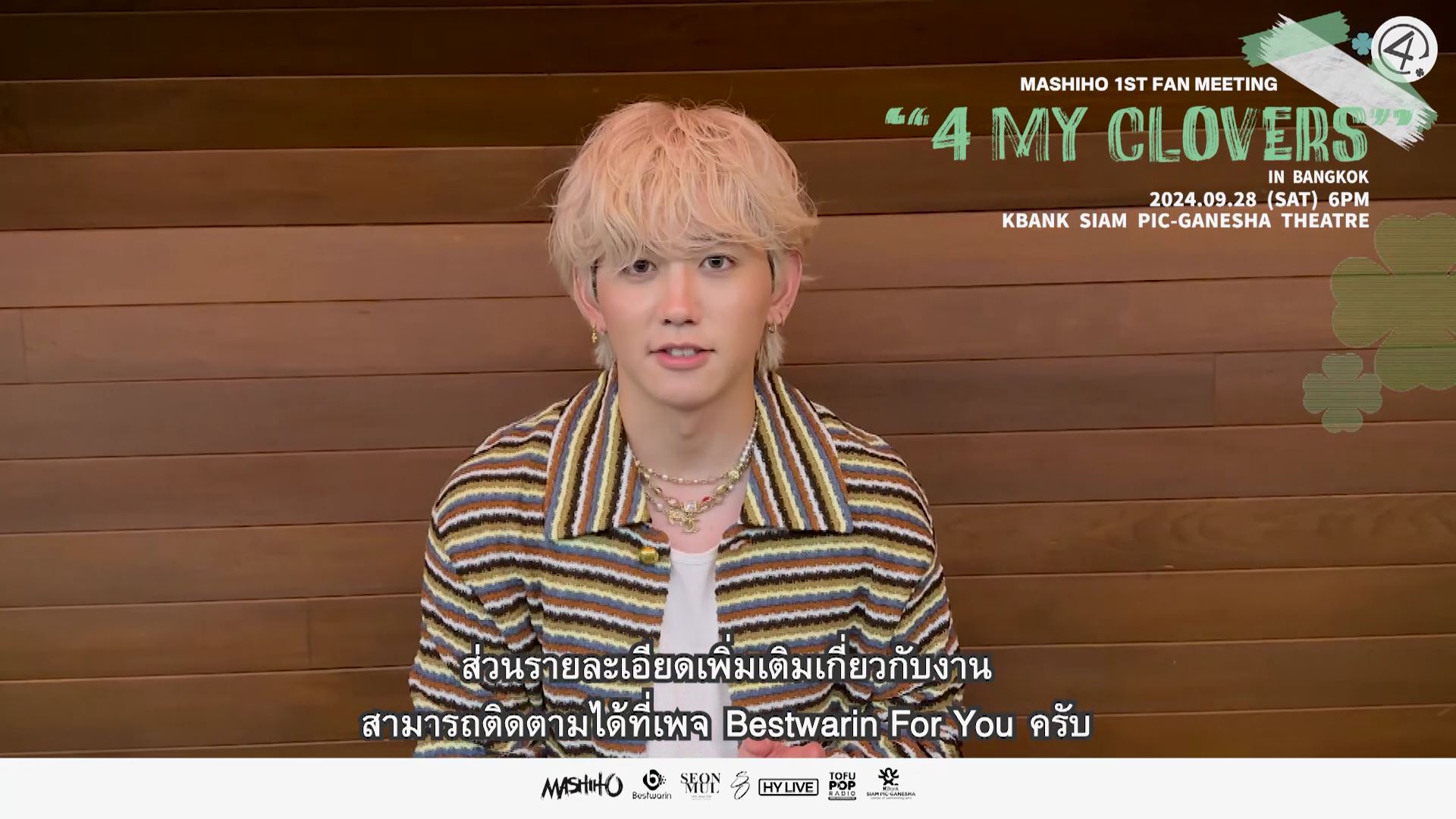 “มาชิโฮะ” ฝากข้อความถึง ไทยโคลเวอร์ “สวัสดีครับ ไทยโคลเวอร์ ผมมาชิโฮะครับ ทุกคนสบายดีใช่ไหมครับ ในที่สุดวันเสาร์ที่ 28 กันยายน 2567 เราก็จะได้เจอกัน ในงาน MASHIHO PRESENTS , 1st FAN MEETING 4 MY CLOVERS IN BANGKOK ที่โรงละครเคแบงก์สยามพิฆเนศแล้วนะครับ ส่วนรายละเอียดเพิ่มเติมเกี่ยวกับงาน สามารถติดตามได้ที่เพจ Bestwarin For You ครับ เจอกันนะครับ”