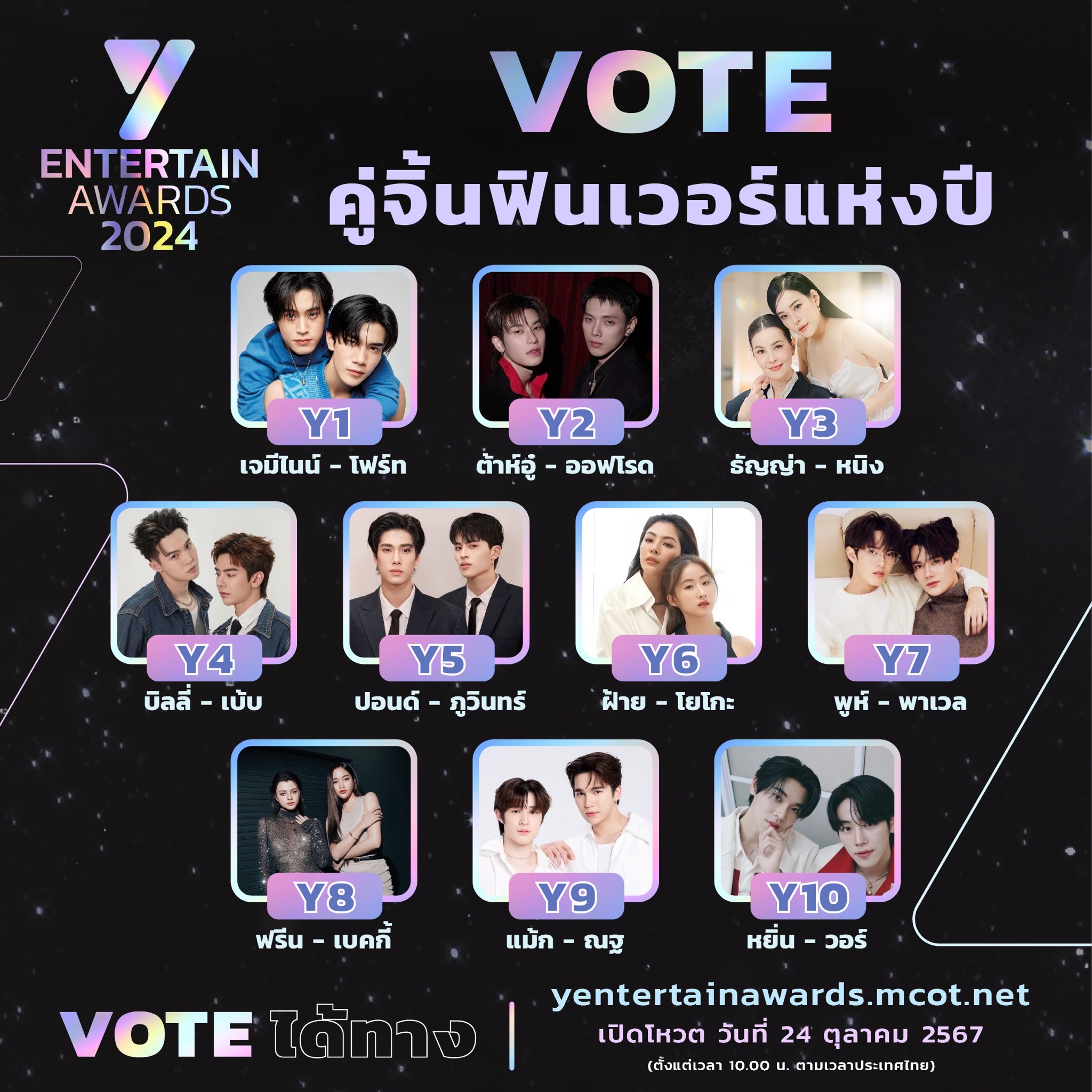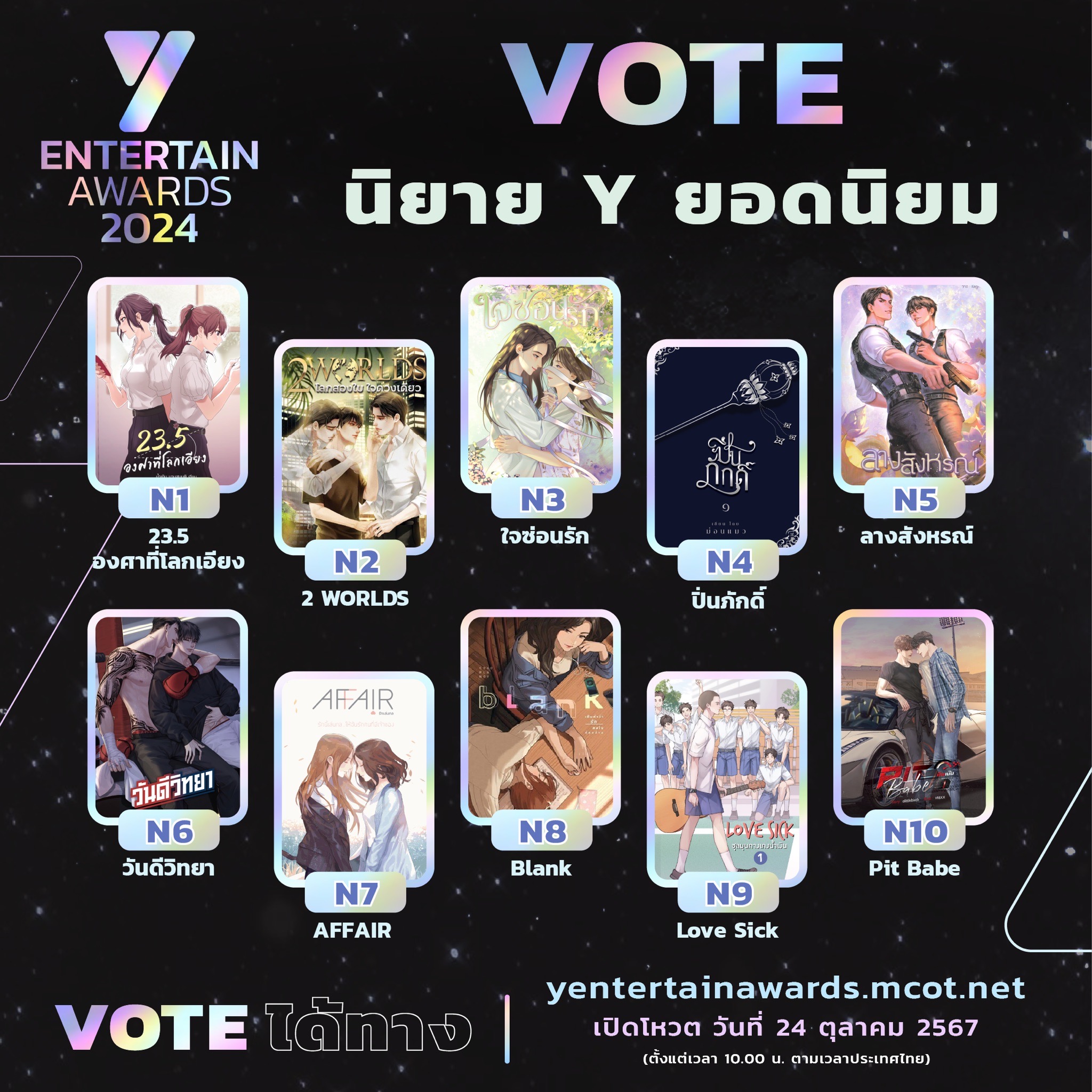 (นิยาย Y ยอดนิยม) N1 – 23.5 องศาที่โลกเอียง, N2 – 2 WORLDS, N3 – ใจซ่อนรัก, N4 – ปิ่นภักดิ์, N5 – ลางสังหรณ์, N6 – วันดีวิทยา, N7 – AFFAIR, N8 – Blank, N9 – Love Sick, N10 – Pit Babe โดยสามารถร่วมโหวตเพื่อเป็นกำลังใจ แรงใจ ให้กับผู้เข้าชิงแต่ละสาขารางวัลทั้ง 5 สาขาได้ทาง https://yentertainawards.mcot.net/ พร้อมเปิดให้โหวตได้ตั้งแต่วันพฤหัสบดีที่ 24 ต.ค. นี้ เป็นต้นไป
