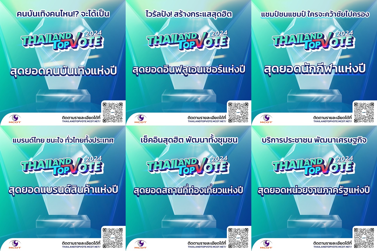 พลาดไม่ได้ที่จะร่วมเป็นส่วนหนึ่งของรางวัล “Thailand Top Vote 2024” ติดตามรายละเอียดเพิ่มเติม พร้อมอัพเดททุกผลการตัดสิน ได้ทางhttps://thailandtopvote.mcot.net/