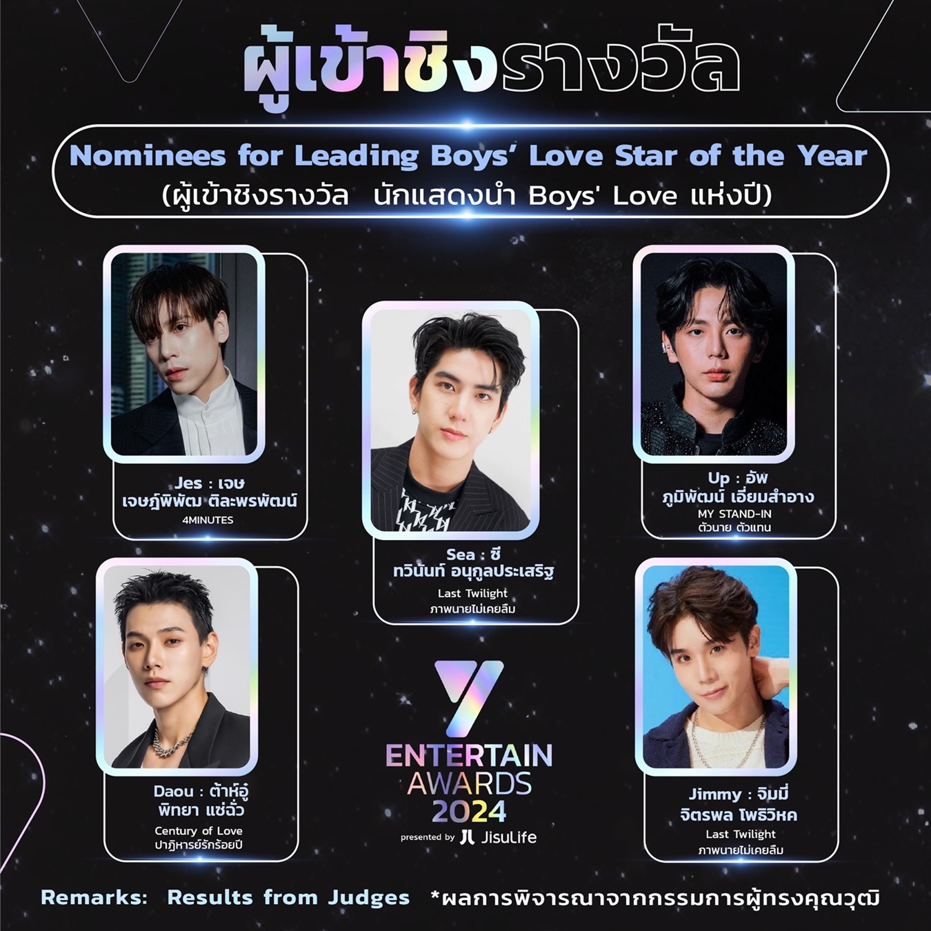 รางวัล Leading Boys’ Love Star of the Year (นักแสดงนำ Boys’ Love แห่งปี) ได้แก่ เจษ-เจษฎ์พิพัฒ ติละพรพัฒน์ 4MINUTES, ซี ทวินันท์ อนุกูลประเสริฐ Last Twilight ภาพนายไม่เคยลืม, อัพ ภูมิพัฒน์ เอี่ยมสำอาง MY STAND-IN ตัวนาย ตัวแทน, ต้าห์อู๋ พิทยา แซ่ฉั่ว Century of Love ปาฏิหารย์รักร้อยปี, จิมมี่ จิตรพล โพธิวิหค Last Twilight ภาพนายไม่เคยลืม