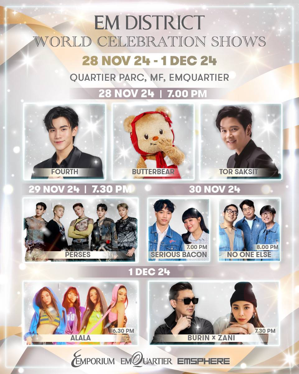 29 พฤศจิกายน 2567 – 1 ธันวาคม 2567 สนุกและสุขตั้งแต่เช้ายันดึกกับเซอร์ไพรส์สุดพิเศษมากมายจากเหล่าศิลปินชื่อดังในงาน “EM DISTRICT 1st Anniversary Big Surprise” กิจกรรมสุดพิเศษให้คุณได้ใกล้ชิดกับดารานักแสดงชื่อดังที่มารอต้อนรับพร้อมมอบของขวัญสุดพิเศษให้กับทุกคน และห้ามพลาด! มินิคอนเสิร์ตสุดมันของเหล่าศิลปิน T-POP สุดฮอต อย่าง PERSES, SERIOUS BACON, NO ONE ELSE, ALALA และ BURIN X ZANI พร้อม LIVE BAND ที่จะมาร่วมร้องเพลงและสร้างความทรงจำสุดพิเศษให้กับทุกคน ณ บริเวณลาน Quartier Parc ศูนย์การค้าเอ็มควอเทียร์