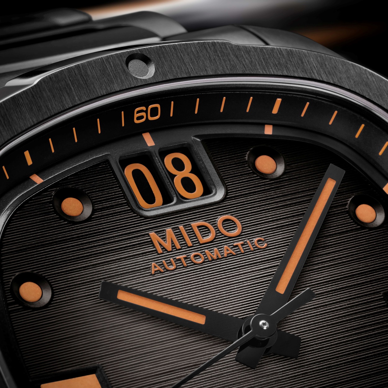 สำหรับดีไซน์ล่าสุดของเรือนเวลาคอลเลกชั่น “มัลติฟอร์ท ทีวี บิ๊ก เดท” (Multifort TV Big Date) ทางแบรนด์ “มิโด” (MIDO) ได้ตีความใหม่โดยหยิบยกรูปทรงอันคลาสสิกของกรอบโทรทัศน์ในสไตล์วินเทจ พร้อมกับนำสีสันประจำแบรนด์ “มิโด” (MIDO) อย่างโทนสีส้มและดำ ซึ่งเป็นคู่สีที่มีความโดดเด่นและสร้างความคอนทราสต์ที่สะดุดตาแต่ทว่าดูลงตัวกันอย่างสวยงาม ตกแต่งบริเวณหน้าปัดแบบขัดลายแนวนอนเกิดเป็นเอฟเฟ็กต์ลายเส้นที่ไล่สีจากเทาไปจนเป็นสีดำเข้มอย่างงดงาม ในขณะที่ช่องแสดงวันที่ (Date) ขนาดใหญ่ ถูกวางไว้ตรงตำแหน่ง 12 นาฬิกา พร้อมการแต่งแต้มให้ดูโดดเด่นในเฉดสีส้ม ซึ่งเป็นเอกลักษณ์ของคอลเลกชั่นนี้ ส่วนตัวเรือนและสายนาฬิกาผลิตจากสแตนเลสสตีลที่เคลือบด้วย PVD สีดำช่วยเสริมรูปลักษณ์ให้ดูมีความทันสมัยมากยิ่งขึ้น ด้านเข็มนาฬิกาทั้งเข็มนาทีและชั่วโมงถูกเคลือบด้วยสารเรืองแสงซูเปอร์ ลูมิโนวา (Super-LumiNova®) สีส้มสดใส ช่วยอ่านค่าในที่แสงน้อยหรือยามค่ำคืน ด้านฝาหลังดีไซน์แบบโปร่งใสที่เผยให้เห็นการทำงานของกลไกคาลิเบอร์ 80 (Caliber 80) รุ่นล่าสุด ที่มีความแม่นยำและความน่าเชื่อถืออย่างน่าทึ่ง ด้วยการสำรองพลังงานสูงสุดถึง 80 ชั่วโมง นอกจากนี้ยังเสริมความแข็งแรงด้วยบาลานซ์สปริงที่ผลิตจากนิวาครอง (Nivachron™) ใช้เทคโนโลยีสูง เพื่อเสริมความแข็งแรงทนทานต่อแรงกระแทกและสนามแม่เหล็กได้เป็นอย่างดี พร้อมคุณสมบัติกันน้ำลึกได้ถึง 10 บาร์/100 เมตร