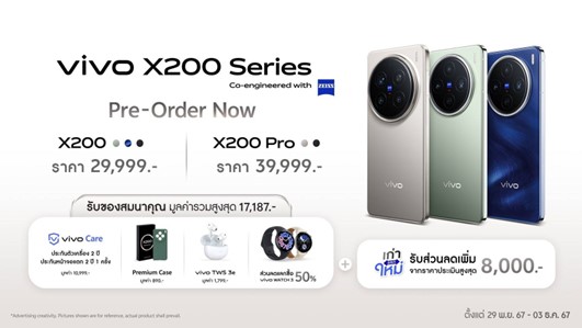vivo X200 Series จะวางจำหน่ายอย่างเป็นทางการตั้งแต่วันที่ 4 ธันวาคม 2024 เป็นต้นไป สำหรับ vivo fans ที่ต้องการเป็นเจ้าของก่อนใคร สามารถจับจองในรอบ Pre-order ได้แล้วตั้งแต่วันนี้ – วันที่ 3 ธันวาคม 2024 ณ ร้านค้า Official Shop ทั่วประเทศ ในราคาและรุ่นความจุ ดังนี้ vivo X200 5G (12GB + 256GB) ราคา 29,999 บาท และ vivo X200 Pro 5G (16GB + 512GB) ราคา 39,999 บาท พร้อมรับสิทธิ์รับของสมนาคุณมูลค่ารวมสูงสุด 17,187 บาท