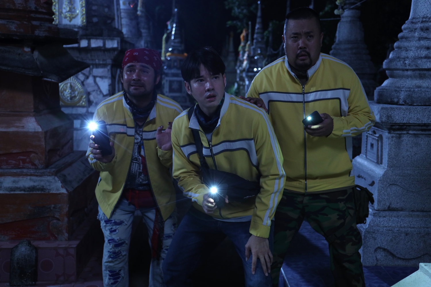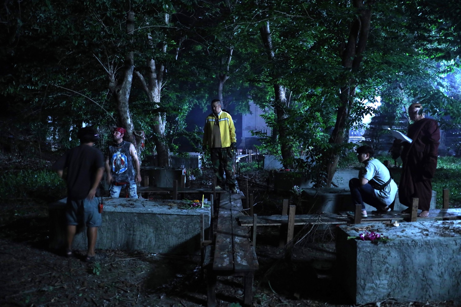 “ที่ ‘วัด’ ผมชอบโครงสร้างมาก มีอายุเก่าแก่กว่า 400 ปี มีความโบราณ ตรงที่เป็นเจดีย์บรรจุอัฐิข้างเมรุทำงานได้สะดวก ชาวแก๊งไรเดอร์ ‘โอ้-โน่-พี่อาร์ต’ ต้องเข้าไปลุยเจดีย์นี้กันจริง มีการขอขมายกมือไหว้ก่อนทำงาน ไม่มีใครลบหลู่ แล้วด้านหน้าวัดที่ทีมอาร์ตไปเซตฉากสุสานเอาไว้ มันเหมือนจริงมากจนใครที่มาเจอต่างถามกันว่าอันนี้ของจริงไหม สภาพโลงศพเราก่อขึ้นมาวางเรียงกันไปในแนวป่า มีพวงมาลัย ศาล มีความรกร้าง และที่สำคัญคือมันคือป่าหลังโบสถ์บริเวณของวัดจริง ถึงจะบอกว่าเซตขึ้นมาแต่นักแสดงก็สงสัยกันตลอด อย่างที่ผมบอกพอบรรยากาศมันได้ ความกลัวจริงๆ ความรู้สึกของทุกคนก็มาเต็ม แล้วตอนที่ถ่ายฉากตรงนี้ก็ตี 1 ตี 2 เลย คงจะมีทั้งความง่วงและความกลัวปนกัน แต่ที่ประทับใจคือทีมนักแสดงเราสปิริตดีมากครับ ทั้งๆ ที่วันนั้น ‘พี่อาร์ต’ ถ่ายท้องหลายรอบ อาการไม่ค่อยจะสู้ดีเท่าไหร่ แต่ก็ผ่านกันมาได้ครับ” ผู้กำกับ “กังฟู นิติวัฒน์” เผยเบื้องหลังความหลอนทรหดของฉากนี้