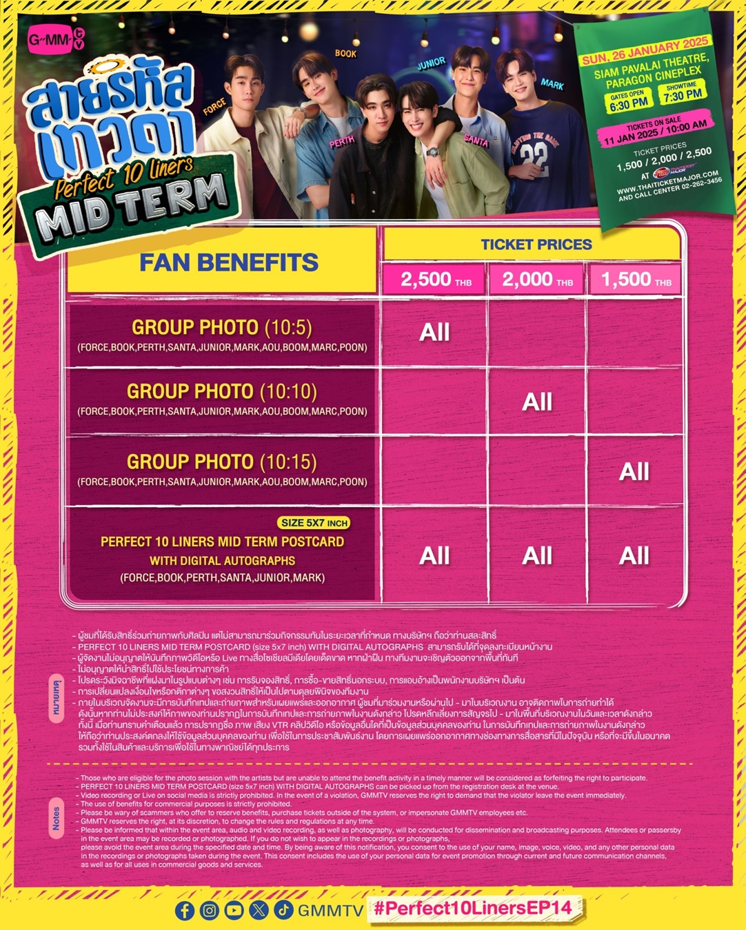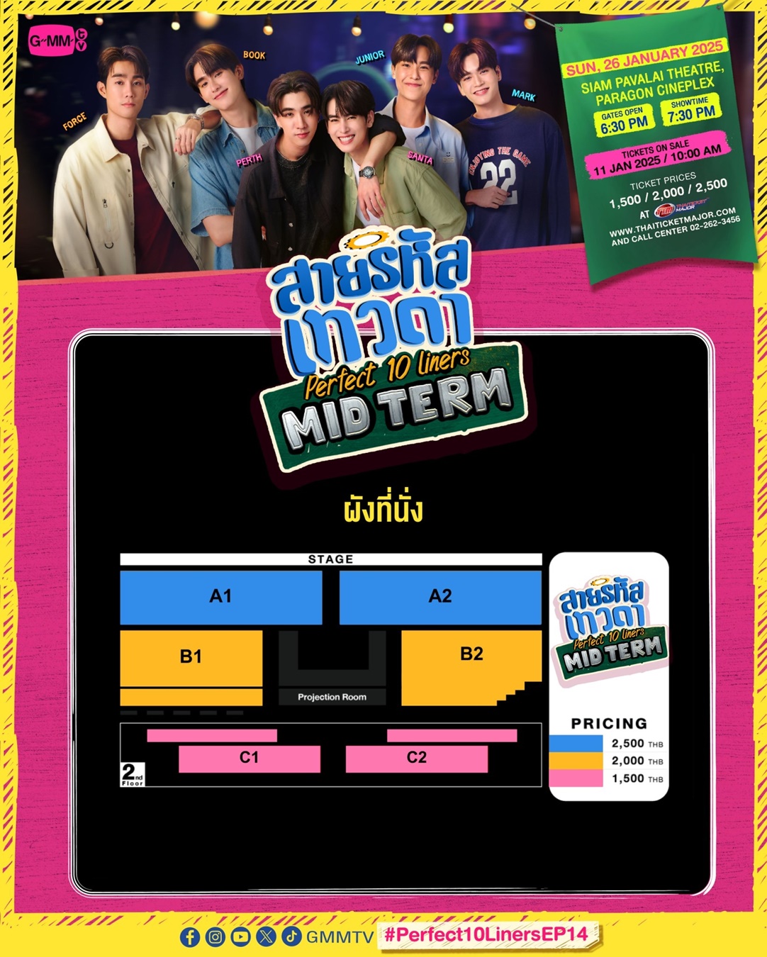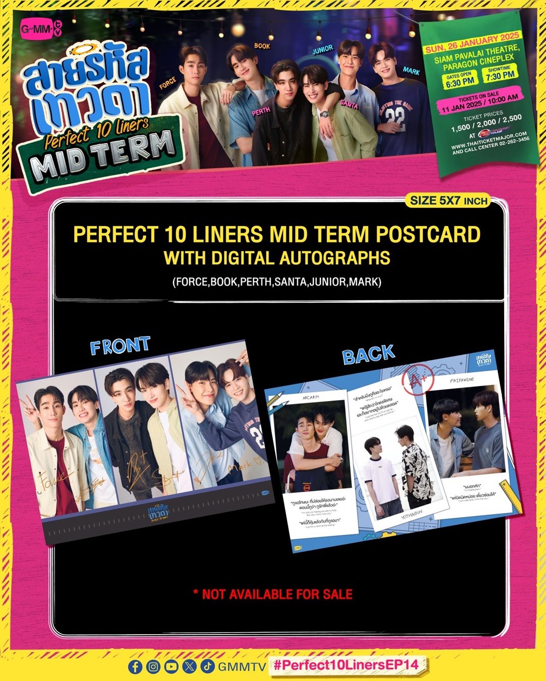 กระแสแรงต่อเนื่องไม่มีแผ่ว เรียกว่าฮอตติดเทรนด์ X ทุก EP ทั้งในประเทศไทย และอีกหลายพื้นที่ทั่วโลก สำหรับซีรีส์ “สายรหัสเทวดา Perfect 10 Liners” ที่เปิดรั้วมหาวิทยาลัยให้แฟนๆ ได้สัมผัสงานดีทุกชั้นปี สายรหัสนี้…เต็มสิบไม่หัก ซีรีส์ที่แฟนๆ ทั้งอินและฟินหนักมาก จาก “GMMTV” คอนเทนต์โพรไวเดอร์ชั้นนำ ของเมืองไทย ที่เรื่องราวเดินทางมาถึงครึ่งเรื่องแล้ว กับความรักวุ่นๆ ในรั้ววิศวะที่สนุกสนานกลมกล่อมครบรส และเพื่อขอบคุณเสียงตอบรับแบบถล่มทลายจากแฟนๆ ล่าสุดทีมนักแสดงสุดฮอต “ฟอส จิรัชพงศ์ ศรีแสง, บุ๊ค กษิดิ์เดช ปลูกผล, เพิร์ธ ธนพนธ์ สุขุมพันธนาสาร, แซนต้า พงศภัค อุดมโภชน์, จูเนียร์ ปณชัย ศรีอาริยะรุ่งเรือง, มาร์ค จิรันธนิน ตรัยรัตนยนต์” จัดให้แบบหนักๆ เปิดเวทีความสนุกอีกครั้ง ชวนแฟนๆ มาร่วมชม “สายรหัสเทวดา Perfect 10 Liners” EP.14 ในงาน “Perfect 10 Liners Mid Term” พร้อมด้วยแก๊งค์เพื่อนสุดซี้อย่าง “อู๋ ธนบูรณ์ เกียรตินิรันดร์, บูม ธราธร จันทรวรกาญจน์, มาร์ค ณฐริศร์ วรกรเลิศสิทธิ์, ปูน มิตรภักดี” ที่กอดคอมาร่วมสร้างสีสัน และพูดคุยกับผู้กำกับฯ คนเก่ง “นิว ศิวัจน์ สวัสดิ์มณีกุล” พิเศษสุดๆ พร้อมรับชมสเปเชียลโชว์สุดเอ็กซ์คลูซีฟจากเหล่านักแสดง ที่รับรองว่าแฟนๆ จะประทับใจไม่รู้ลืม ในวันอาทิตย์ที่ 26 มกราคม 2568 เวลา 19.30 น. ณ ชั้น 6 สยามพารากอน โรงภาพยนตร์สยามภาวลัย Paragon Cineplex