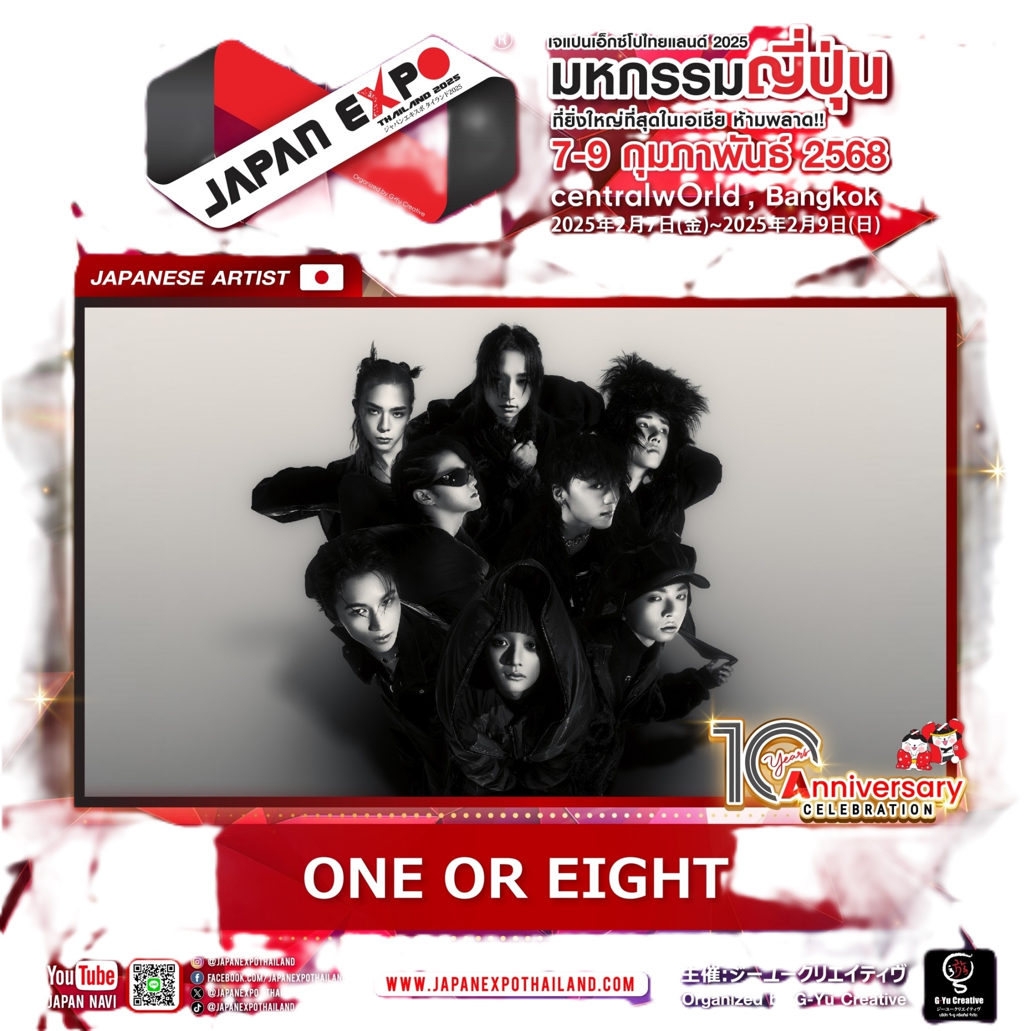 ใกล้วันเข้ามาทุกทีรายชื่อศิลปินที่จะมาร่วมงานก็เริ่มทยอยออกมา  โดยในครั้งนี้ก็มาถึงคิวของ 8 หนุ่มหน้าใส “ONE OR EIGHT” (วัน ออร์ เอท) ที่จะบินมาร่วมฉลองครบรอบ 10 ปีไปพร้อมๆกัน กับงานมหกรรมญี่ปุ่นที่ยิ่งใหญ่ที่สุด ที่จัดโดยบริษัท จี-ยู ครีเอทีฟ จำกัด จำกัด พร้อมด้วยเหล่าพันธมิตรทั้งภาครัฐและเอกชน อาทิ  โออิชิ, บริษัท ตรีเพชรอีซูซุเซลส์ จํากัด, บริษัท การบินไทย จำกัด (มหาชน), การท่องเที่ยวแห่งประเทศไทย,  สถานเอกอัครราชทูตญี่ปุ่นประจำประเทศไทย, เจแปนฟาวด์เดชั่น, องค์การส่งเสริมการท่องเที่ยวแห่งประเทศญี่ปุ่น  (JNTO), องค์การส่งเสริมการค้าต่างประเทศของญี่ปุ่น (JETRO), สมาคมญี่ปุ่นในประเทศไทย Japanese Association in Thailand  และ CEA (Creative Economy Agency) หรือ สำนักงานส่งเสริมเศรษฐกิจส้างสรรค์ (องค์การมหาชน) ผนึกกำลังจัดงานอีเว้นท์ญี่ปุ่นที่ใหญ่ที่สุดในเอเชีย ในระหว่างวันศุกร์ที่ 7 – วันอาทิตย์ที่ 9 กุมภาพันธ์ 2568 ตั้งแต่ 10.00-21.00 น. ณ ศูนย์การค้าเซ็นทรัลเวิลด์