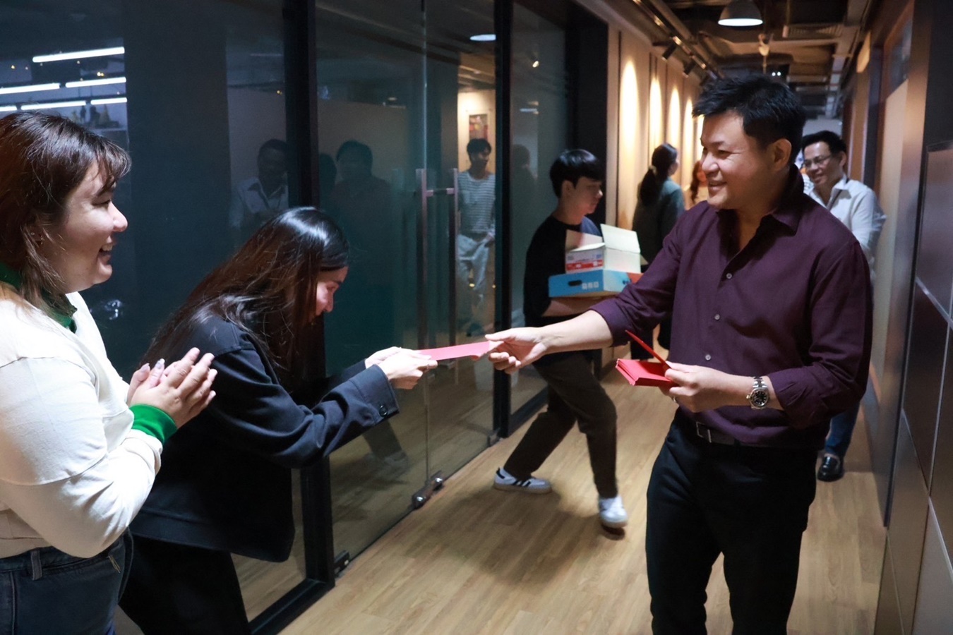 คุณถกลเกียรติ วีรวรรณ ประธานเจ้าหน้าที่บริหารกลุ่ม บริษัท เดอะ วัน เอ็นเตอร์ไพรส์ จำกัด (มหาชน) ถือฤกษ์ดี เนื่องในเทศกาลตรุษจีน ประจำปี 2568 นี้ เดินสายมอบ “อั่งเปา” ให้กับเหล่าพนักงานในเครือบริษัท “เดอะ วัน เอ็นเตอร์ไพรส์” อาทิ ช่องวัน31 , GMMTV, CHANGE 2561 , Atime media , GMM Studios , Exact-Scenario รวมถึงทีมแม่บ้าน , รปภ. , ผู้เกี่ยวข้องภายในตึกจีเอ็มเอ็ม แกรมมี่ เพื่อมอบเป็นของขวัญต้อนรับ “วันปีใหม่จีน” เสริมมงคลให้ชีวิตเต็มไปด้วยความสุข มีสุขภาพแข็งแรง พร้อมด้วยความโชคดี มั่งคั่ง นับเป็นอีกหนึ่งกำลังใจ ที่ช่วยสร้างรอยยิ้มและความสุขให้กับพนักงานอีกครั้ง