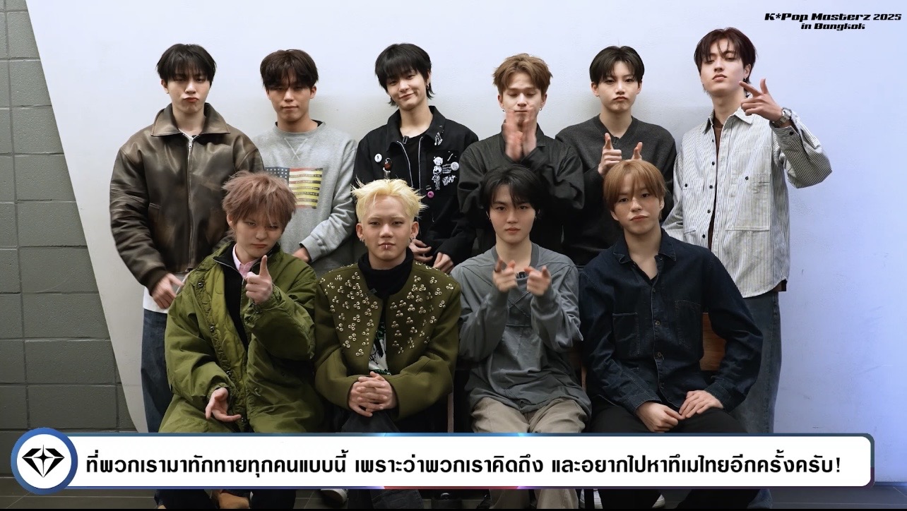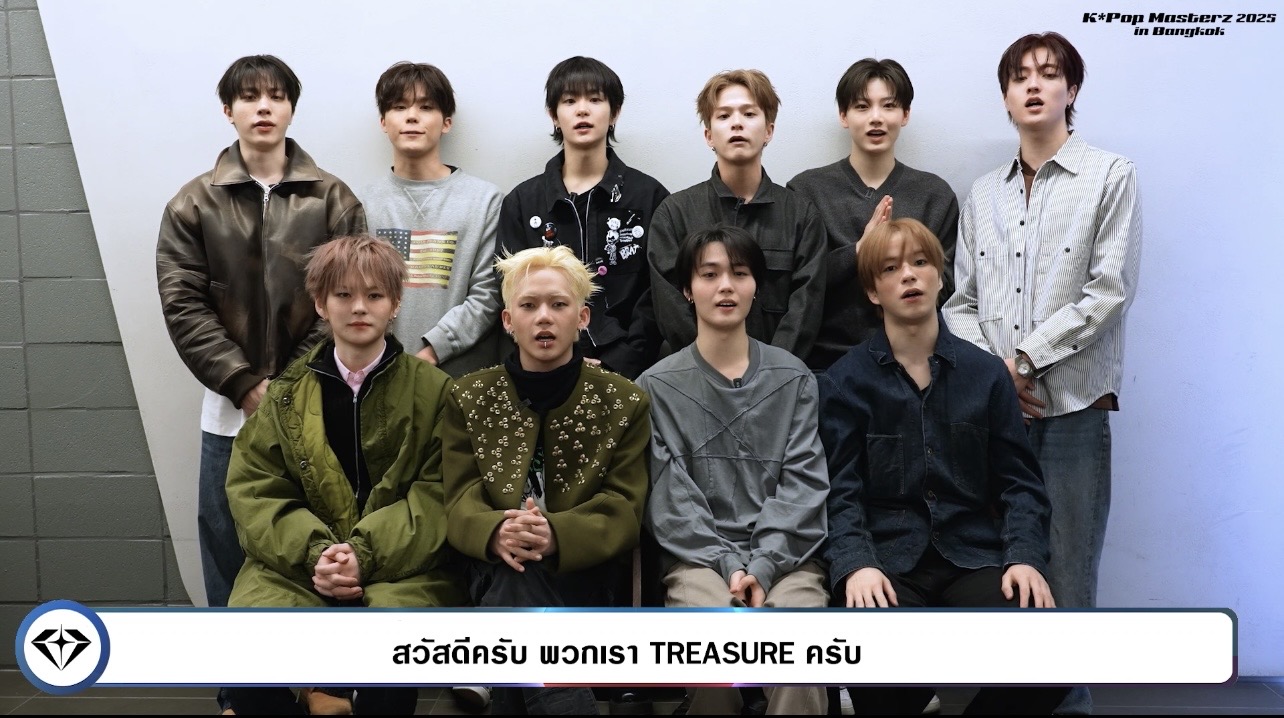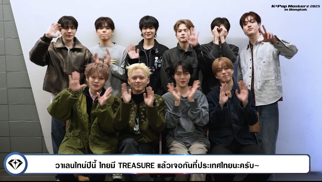 หนุ่มๆ “TREASURE” ส่งคลิปทักทาย พร้อมบอกว่าคิดถึงชาวทึเมไทย “สวัสดีครับ พวกเรา TREASURE ครับ ที่พวกเรามาทักทายทุกคนแบบนี้ เพราะว่าพวกเราคิดถึง และอยากไปหาทึเมไทยอีกครั้งครับ ทุกคนก็คิดถึงพวกเราใช่ไหมครับ ถ้างั้นเจอกันที่งาน K-Pop Masterz 2025 in Bangkok ในวันที่ 14 กุมภาพันธ์ ที่ Impact Arena นะครับ ตอนนี้เปิดขายบัตรแล้วที่ Thai Ticketmajor ครับ พวกเราดีใจมาก ที่จะได้ไปหาทึเมบ่อยๆ ทุกคนจะมามอบความรักให้พวกเรากันใช่มั้ยครับ วันวาเลนไทน์ปีนี้มาร่วมใช้เวลาที่หอมหวานไปด้วยกันนะครับ วาเลนไทน์ปีนี้ ไทยมี TREASURE แล้วเจอกันที่ประเทศไทยนะครับ”