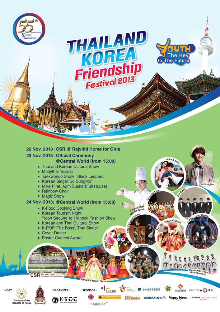 สถานเอกอัครราชทูตสาธารณรัฐเกาหลี ประจำประเทศไทย (Embassy of the Republic of Korea)ร่วมกับ กระทรวงวัฒนธรรม (Ministry of Culture, Thailand) จัดงาน “Thailand-Korea Friendship Festival 2013 ‘Youth, the Key to The Future’ เพื่อส่งเสริมเยาวชนซึ่งเป็นอนาคตของชาติให้มีกิจกรรมสร้างสรรค์และเป็นประโยชน์ โดยจัดขึ้นในวันที่23-24 พฤศจิกายน2556 ณลานหน้าเซ็นทรัลเวิลด์ตั้งแต่เวลาประมาณ13.00-21.00 น. โดยมี บริษัท เค.ที.ซี.ซี จำกัด เป็นผู้ดำเนินการจัดงาน