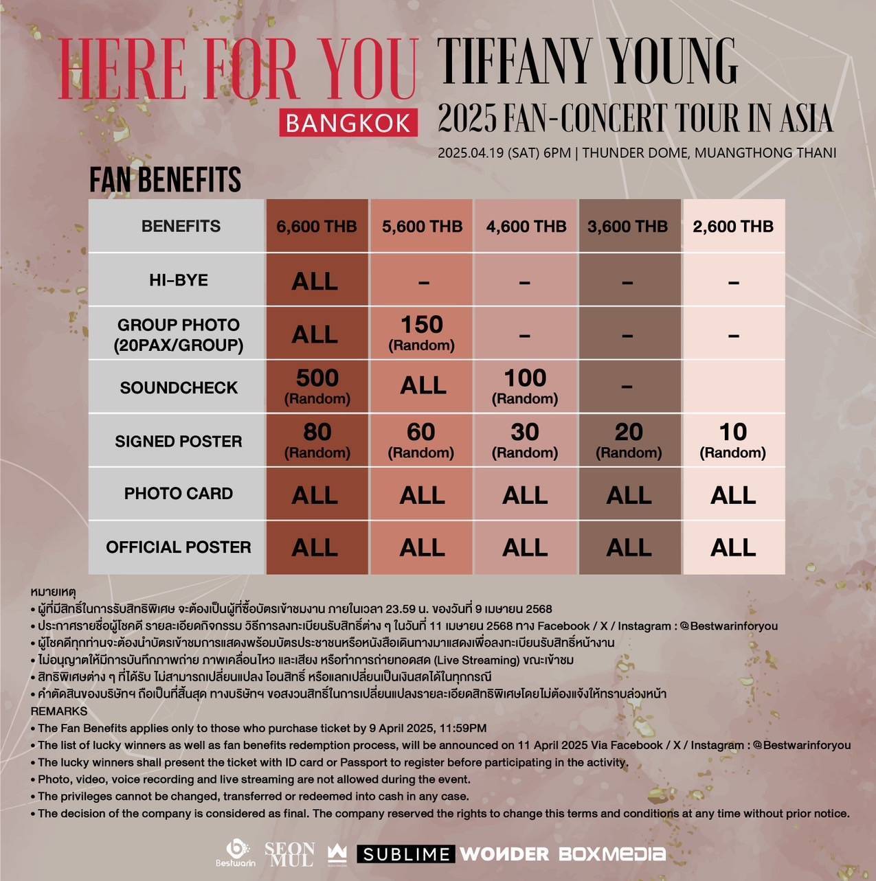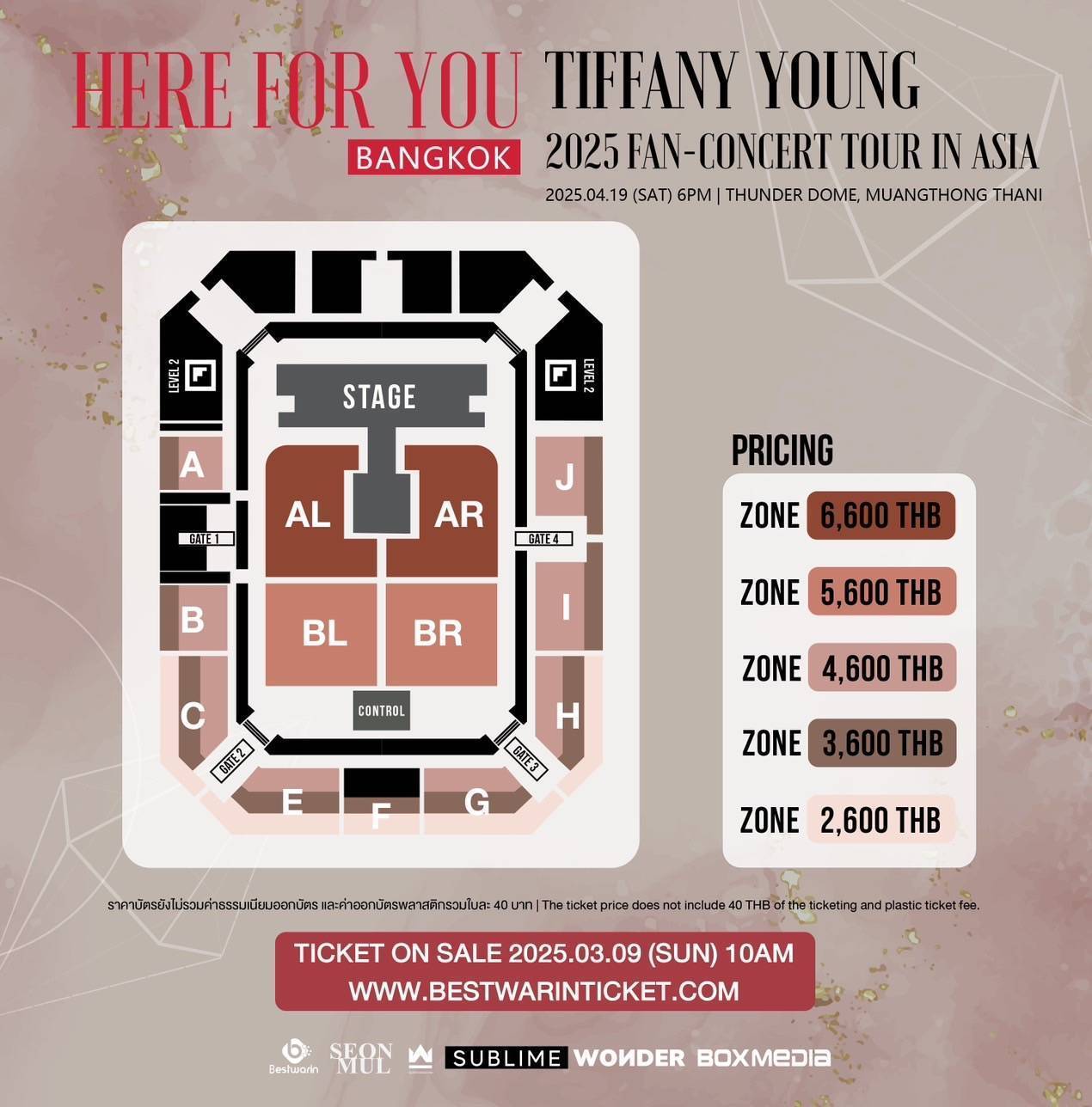 ผู้จัดใจดีอย่าง Bestwarin For You จะพาเหล่า ยองวอนไทย และ โซวอนไทย ไปพบกับรอยยิ้มสดใส กับแฟนคอนเสิร์ตเต็มรูปแบบ ที่ “ทิฟฟานี่” จะมามอบความสุขและความสนุกให้กั บแฟนๆ ชาวไทยอย่างเต็มอิ่ม หลังจากที่ไม่ได้เจอแฟนๆ ชาวไทยนานถึง 2 ปี ครั้งนี้ “ทิฟฟานี่” จะทำให้ทุกคนใจฟูอย่างแน่นอน ให้สมการรอคอยของแฟนๆ