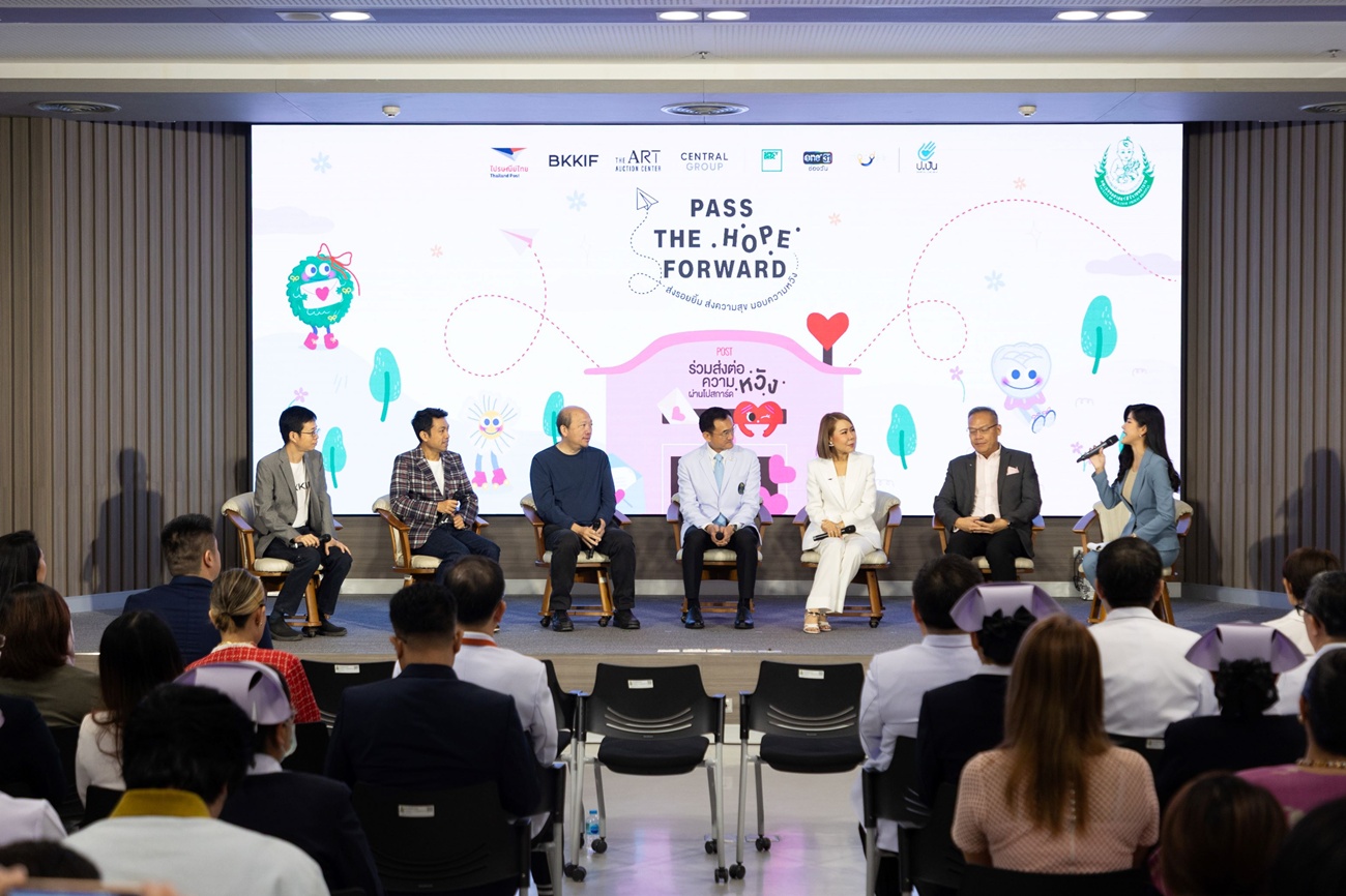 ดร.วราภรณ์ ข้องเกี่ยวพันธุ์ ประธานเจ้าหน้าที่บริหาร สายงานกลยุทธ์และการขับเคลื่อนองค์กร บริษัท ไปรษณีย์ไทย จํากัด, อัศวิน ตีระวัฒนพงษ์ ผู้ช่วยกรรมการผู้จัดการใหญ่อาวุโส ฝ่ายโครงการพิเศษ กลุ่มเซ็นทรัล, บอย โกสิยพงษ์ ผู้ริเริ่มโครงการและสร้างสรรค์บทเพลง Pass the Hope Forward, ป๊อด ธนชัย อุชชิน ศิลปินที่ร่วมออกแบบโปสการ์ด และวิภว์ บูรพาเดชะ ผู้ก่อตั้ง Bangkok illustration Fair (BKKIF) ร่วมเสวนาในงานแถลงข่าวครั้งนี้