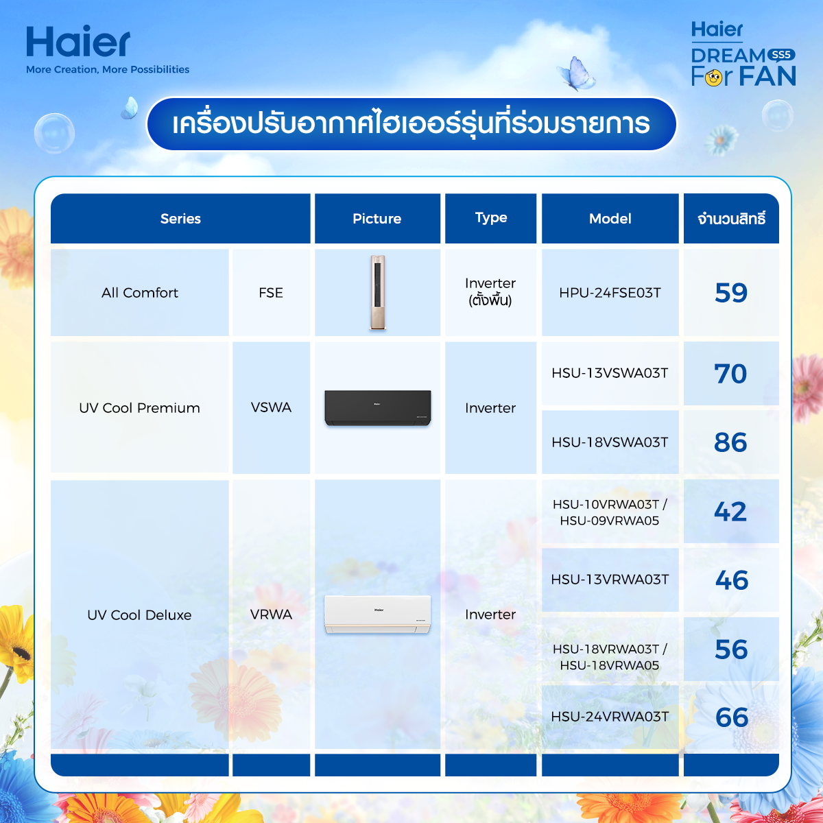 2. เครื่องปรับอากาศไฮเออร์รุ่นที่ร่วมรายการสามารถดูได้จากสื่อประชาสัมพันธ์ตามไฟล์แนบ
