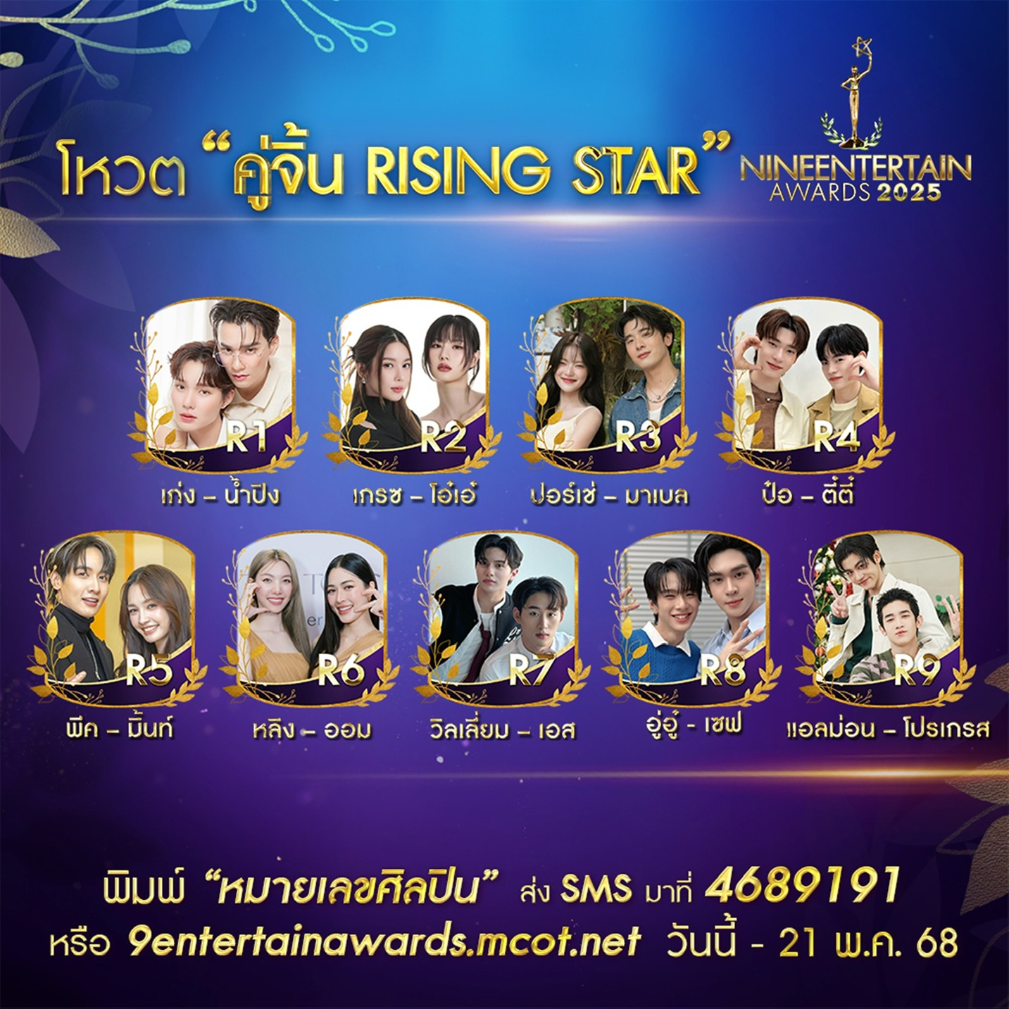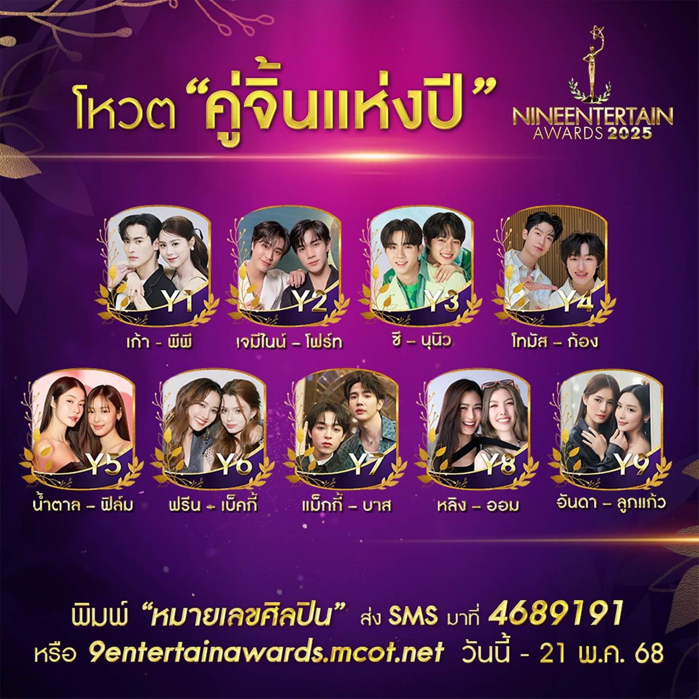 “สำหรับงานประกาศรางวัลหน้าม่านคุณภาพ หลังม่านคุณธรรม “ไนน์เอ็นเตอร์เทน อวอร์ด 2025” ที่ทาง อสมท จัดขึ้นทุกปี เพื่อเป็นกำลังใจ แรงใจ ให้กับนักแสดง ศิลปินในวงการบันเทิงหลากหลายสาขา โดยมี 3 สาขาที่คนทั้งประเทศสามารถร่วมโหวตได้ นั่นก็คือ รางวัล “ขวัญใจมหาชน” ซึ่งตอนนี้เราได้ผู้ผ่านเข้ารอบ มีทั้งนักแสดงและศิลปิน โดยเรามีการเรียงตามลำดับชื่อจริง เริ่มที่ M1 ไรอัล กาจบัณฑิต, M2 นุนิว ชวรินทร์, M3 โตโต้ ธนเดช, M4 ไมกี้ ปณิธาน, M5 ซี พฤกษ์, M6 แจม รชตะ, M7 หลิงหลิง ศิริลักษณ, M8 ฟรีน สโรชา, M9 อิงฟ้า ตามมาด้วย คู่จิ้นแห่งปี มี 9 คู่จิ้นที่เข้ารอบ Y1 เก้า – พีพี, Y2 เจมีไนน์ – โฟร์ท, Y3 ซี – นุนิว, Y4 โทมัส – ก้อง, Y5 น้ำตาล – ฟิล์ม, Y6 ฟรีน – เบ็คกี้, Y7 แม็กกี้ – บาส, Y8 หลิง – ออม, Y9 อันดา – ลูกแก้ว และปิดท้ายด้วยผู้เข้ารอบชิงรางวัลคู่จิ้น Rising Star ซึ่งเรียงลำดับตามชื่อเล่น R1 เก่ง – น้ำปิง, R2 เกรซ – โอ๋เอ๋, R3 ปอร์เช่ – มาเบล, R4 ป๋อ – ตี๋ตี๋, R5 พีค – มิ้นท์, R6 หลิง – ออม, R7 วิลเลี่ยม – เอส, R8 อู่อู๋ – เซฟ, R9 แอลม่อน – โปรเกรส ซึ่งสามารถร่วมโหวตผู้เข้าชิงทั้ง 3 สาขาที่ชื่นชอบได้แล้วนะครับ ได้ 2 ช่องทางและได้แบบไม่จำกัดจำนวนครั้ง ส่ง SMS มาที่หมายเลข 4689191 และทางเว็บไซต์ https://9entertainawards.mcot.net”