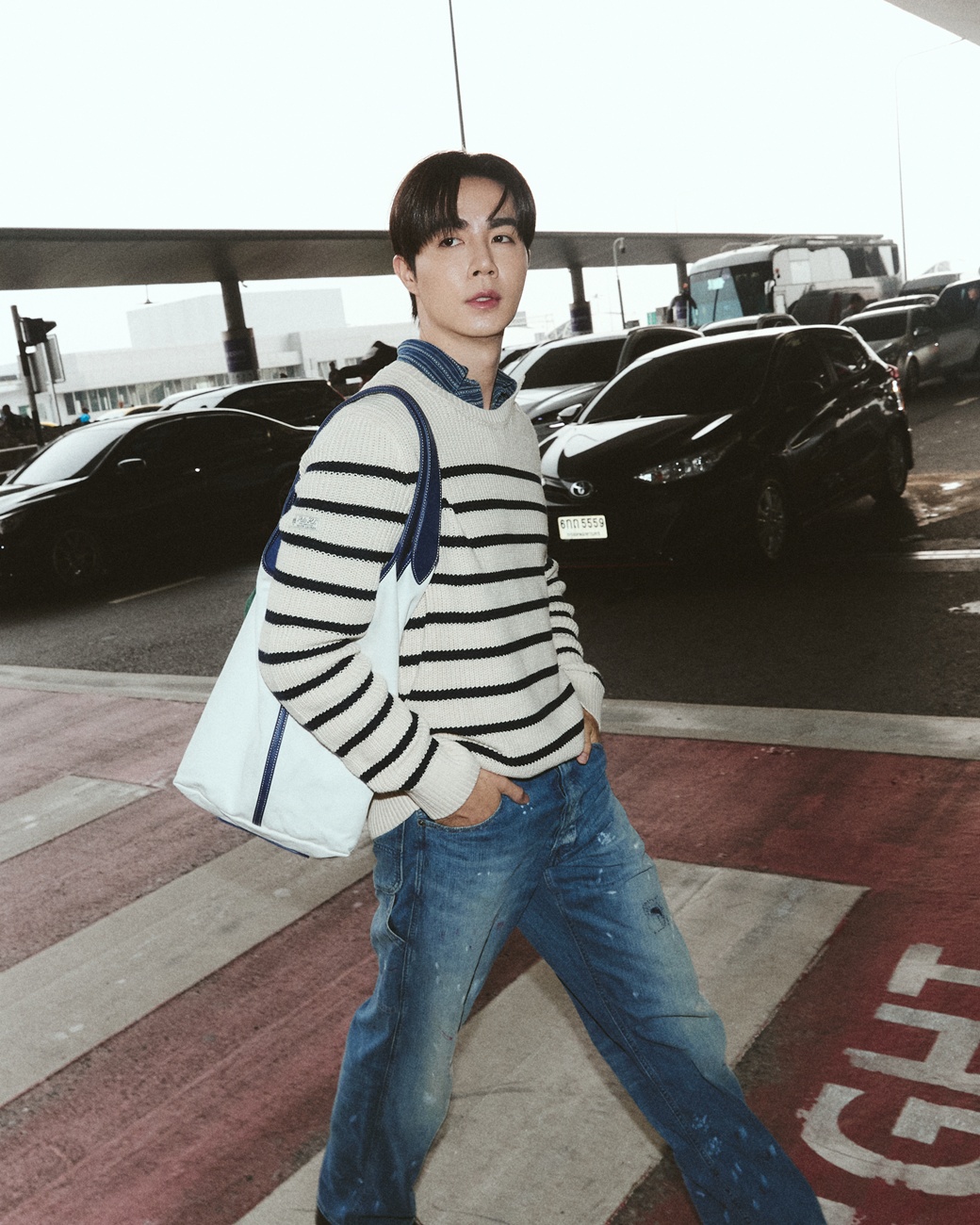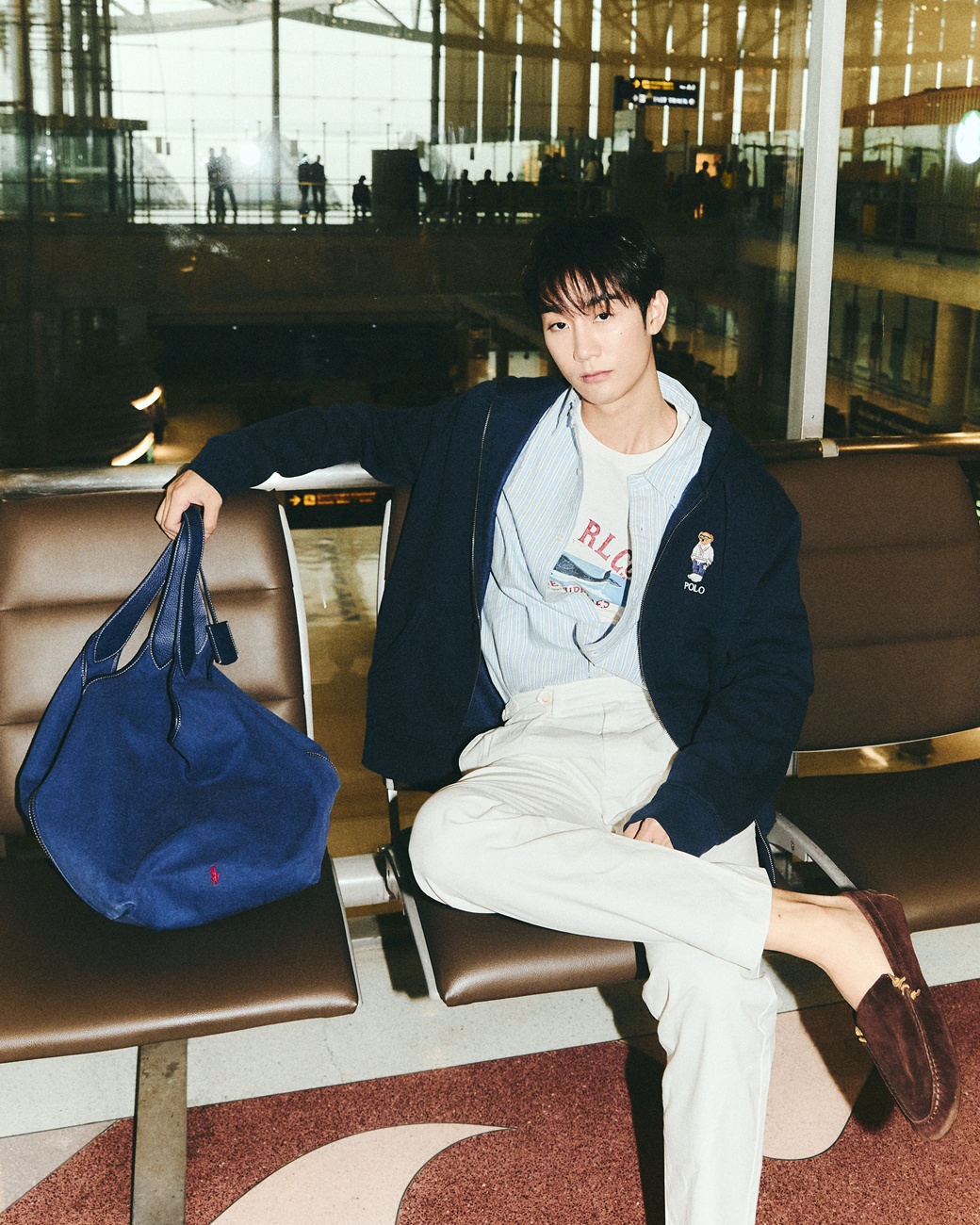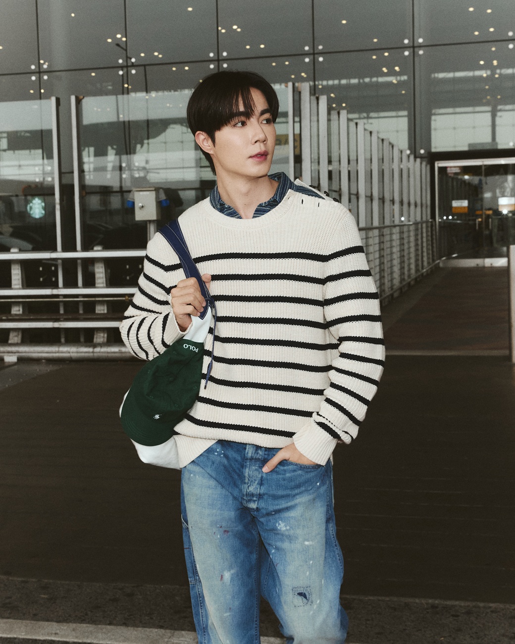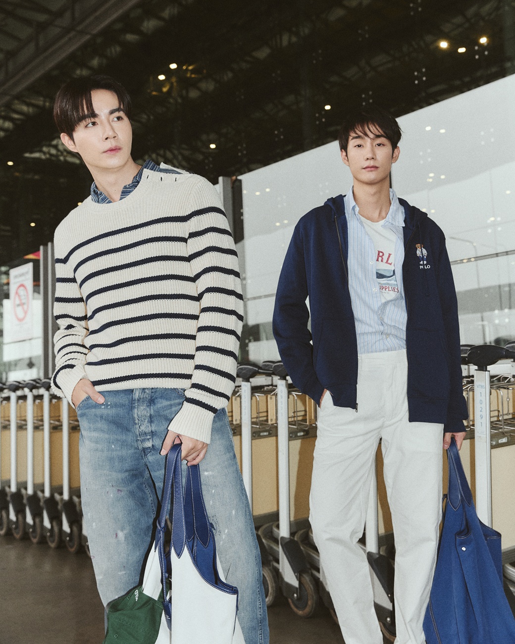 ส่วนหนุ่ม ซี – พฤกษ์ พานิช มาในมู้ดแอนด์โทนสีที่คล้ายกัน แต่เพิ่มลูกเล่นที่โดดเด่นด้วยการเลเยอร์เสื้อโปโล กับเสื้อสเวตเตอร์ลายทาง ผ้าคอตตอนลินิน จับคู่กับกางเกงยีนส์ทรงคาร์เพนเตอร์สีอ่อน และเลือกถือกระเป๋า Polo Play Canvas Tote สุดฮิตที่ทุกคนต้องมี