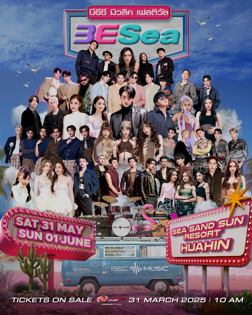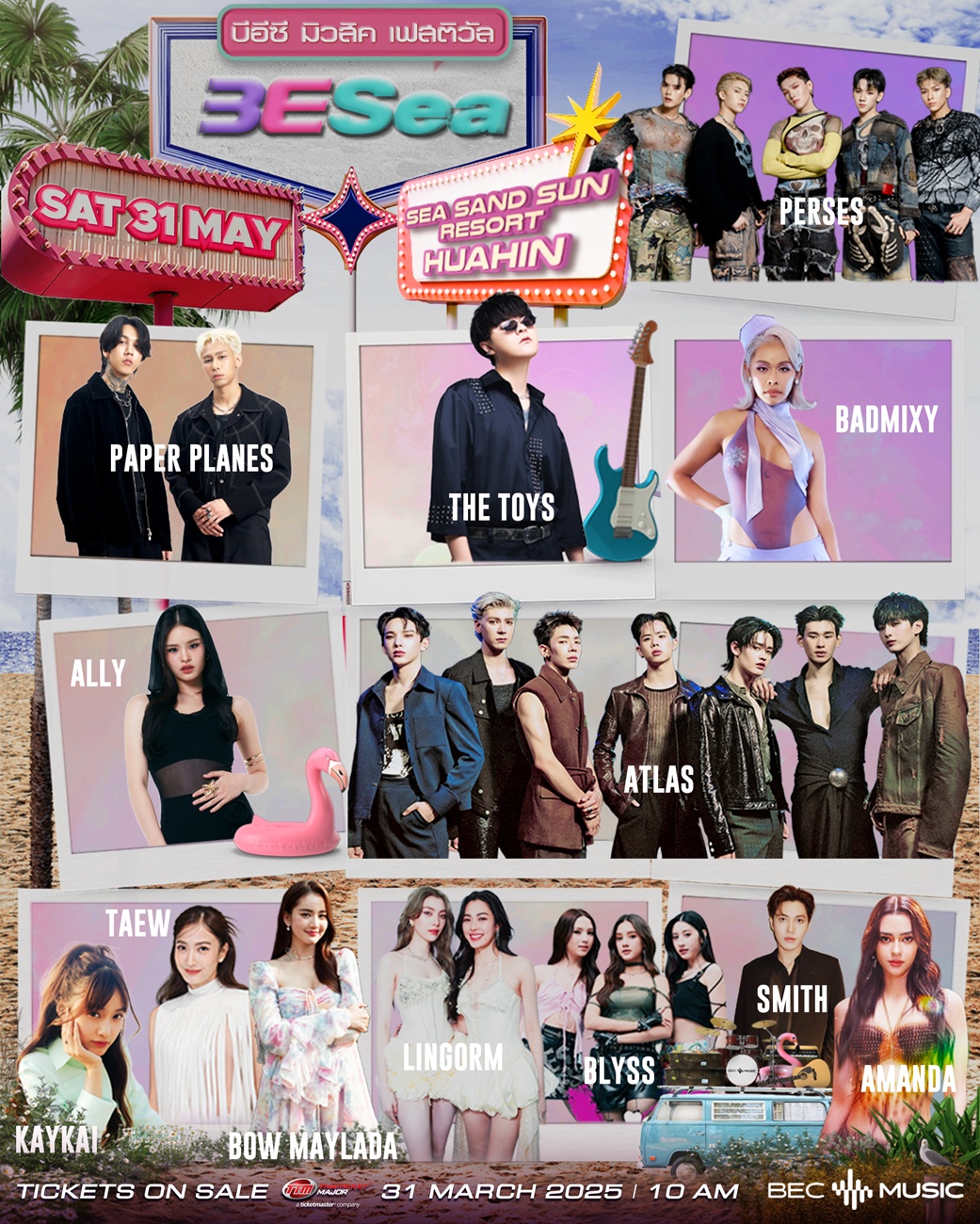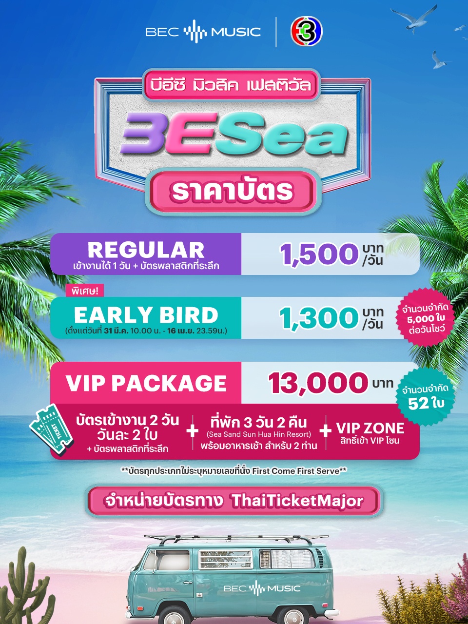เตรียมกดบัตรได้แล้วตั้งแต่วั นนี้ กับงานเทศกาลดนตรีสุดยิ่งใหญ่ ครั้งแรกของช่อง 3 “BESea Music Festival 2025” ที่จะทำให้คุณฮอตไปทั้งหาด งานนี้จัดหนักจัดเต็มความสนุกสุ ดเหวี่ยงกับกองทัพศิลปินสุดฮิ ตฮอตตลอดสองวันเต็ม ในวันเสาร์ที่ 31 พฤษภาคม 2568 รวมตัวมาแดนซ์สุดมันส์ไปกั บ ATLAS, ALLY, BADMIXY, PERSES, PAPER PLANES, THE TOYS และศิลปินค่าย BEC Music นำทีมโดย แต้ว ณฐพร, โบว์ เมลดา, เก๋ไก๋, อแมนด้า, สมิธ, Blyss และ หลิงออม ในวันอาทิตย์ที่ 1 มิถุนายน 2568 เตรียมตัวมากรี๊ดสนั่นไปกับ BODYSLAM, JEFF SATUR, MEAN BAND, POLYCAT, PIXXE, PROXIE, SLAPKISS และศิลปินค่าย BEC Music ได้แก่ โบว์ เมลดา, เก๋ไก๋, อแมนด้า, สมิธ, Blyss และ หลิงออม โดยงานนี้จัดขึ้นที่ SEA SAND SUN HUA HIN RESORT ชะอำ จ.เพชรบุรี ประตูเปิดตั้งแต่เวลา 14:00 น. เป็นต้นไป ราคาบัตร 1,300 (EARLYBIRD REGULAR) / 1,500 (REGULAR) และ 13,000 (VIP PACKAGE สำหรับ 2 ท่าน) เริ่มจำหน่ายบัตร ในวันจันทร์ที่ 31 มีนาคม 2568 ตั้งแต่ 10.00 น. ทางเคาน์เตอร์ไทยทิคเก็ตเมเจอร์ ทุกสาขาhttps://www. thaiticketmajor.com/concert/ besea-music-festival-2025.html