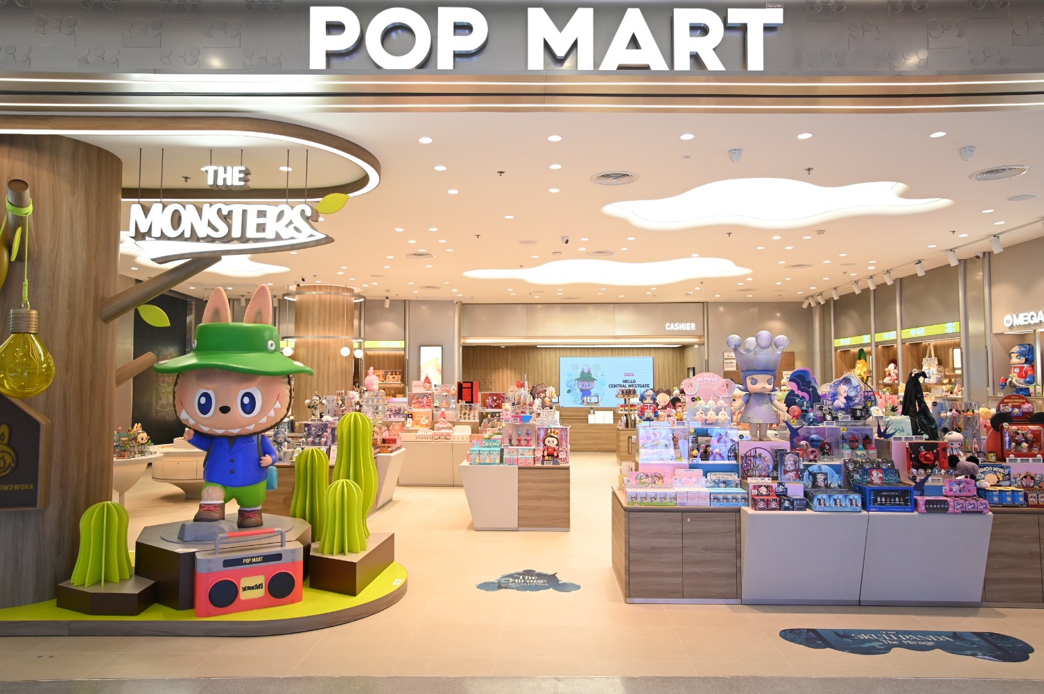 POP MART THAILAND เปิดสาขากรุงเทพฯ โซนตะวันตกเป็นแห่งแรก ณ ศูนย์การค้าเซ็นทรัล เวสต์เกต ช็อปปิ้งมอลล์ที่ใหญ่ที่สุดในโซนตะวันตก แหล่งรวมสินค้าแฟชั่น บิวตี้ ไลฟ์สไตล์ และสิ่งอำนวยความสะดวกมากมาย โดยที่สาขาใหม่แห่งนี้เป็นการรวบรวมสินค้าฮิตไว้มากที่สุด รวมถึงไฮไลท์เด็ดๆ ไว้มากมาย ไม่ว่าจะเป็นมุมใหม่ที่รวบรวม Plush Doll จากหลากหลาย IP หรือมุม POP BEAN ดีไซน์ใหม่ที่ไม่เคยมีที่ไหนมาก่อน พิเศษเฉพาะที่เซ็นทรัล เวสต์เกต เป็นที่แรก รวมถึงการตกแต่งร้านด้วยคอนเซ็ปต์ใหม่เป็นสาขาที่ 2 ที่มอบทั้งความอบอุ่นและความทันสมัยคราวเดียว ที่สำคัญครั้งนี้มาพร้อมจอซีทรูสกรีนขนาดใหญ่ที่สุด และมุมถ่ายรูปที่ทุกคนจะต้องไม่พลาดอย่าง Big figure LABUBU จากคอลเลกชัน THE MONSTERS Camping Series ที่ตั้งอยู่ทางเข้าหน้าร้านอย่างโดดเด่น