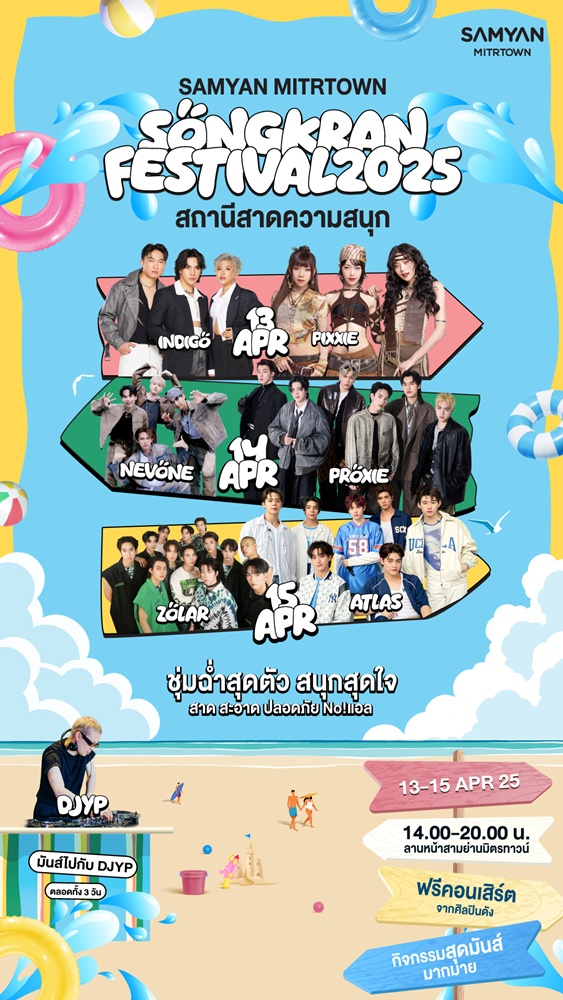 นอกจากจะได้เปียกกันให้สะใจแล้ว ยังมีโซนให้สนุกไปกับเสียงเพลง นำทัพโดย ฟรี!!คอนเสิร์ตจากศิลปินดังตลอด 3 วัน เริ่มตั้งแต่วันที่ 13 เม.ย. สนุกไปกับ Indigo และ PiXXIE 14 เม.ย. พบกับ NEVONE และ Proxie 15 เม.ย. มันส์ต่อกับ Zolar และ Atlas และทุกค่ำคืนตั้งแต่ 19.00 น. ไปแดนซ์ให้สุดกับ DJYP ที่จะมาเขย่าความมันส์ให้เดือดถึงขีดสุด! ยังไม่พอ!พร้อมเปิดพื้นที่สร้างสรรค์คอมมูนิตี้ของคนรักเสียงดนตรีวาดลวดลายได้ไม่ต้องอายใคร เพราะนี่คือเวทีสาธารณะสำหรับทุกเพศทุกวัย กับวงดนตรี Live Band นับ10 วง อาทิ all season band, WRAPP, Zoneteens , capybara ที่ขนความมันส์มาให้โยกกันแบบไม่มีพัก! และเอาใจสายแดนซ์กับ Random Dance ชวนมาแดนซ์ออนเดอะฟอลท่ามกลางความเปียกฉ่ำ ที่สามย่านจัดมาให้ครบทุกเพลย์ลิสท์สุดฮิตทั้ง เค-ป๊อป ที-ป๊อป สนุกไม่มีสะดุด จัดเต็มวันล่ะ 3 รอบ 15.00 -16.00 น. , 17.00 – 18.00 น. , 19.00 – 20.00 น. ตลอด 3วัน