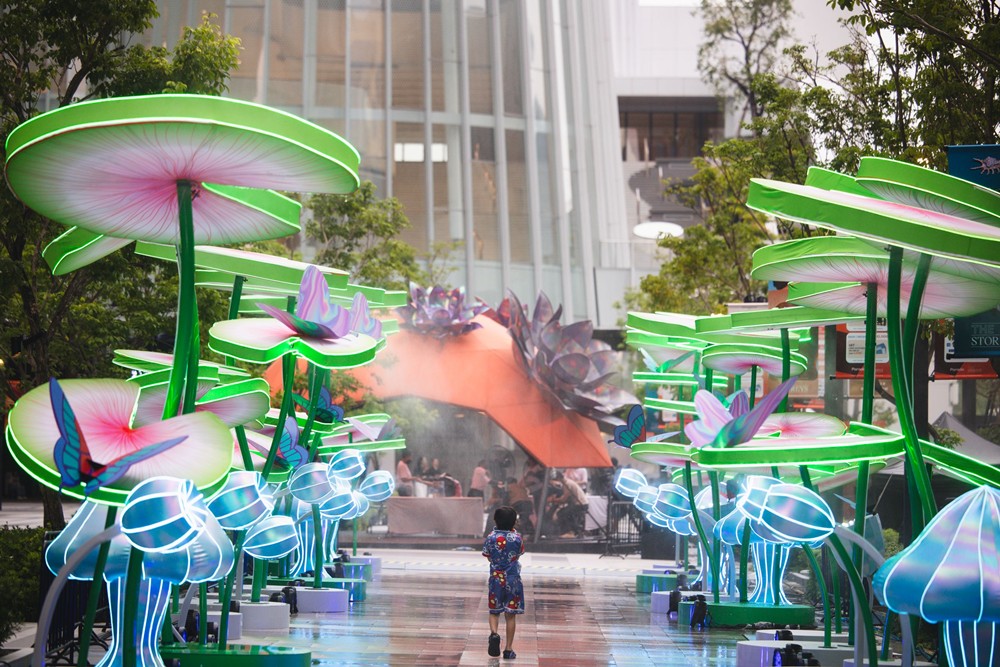 MISTICAL FOREST: Step into an enchanting urban forest along One Bangkok Boulevard, where the cool mist and gentle spray of water dance through giant lotus leaves. Immerse yourself in a symphony of light and the mesmerising flutter of butterflies. Rejuvenate your mind and body with relaxing activities like Sound Bath and revitalising neck, shoulder, and back massages by RLAX at the Activity Pavilion.