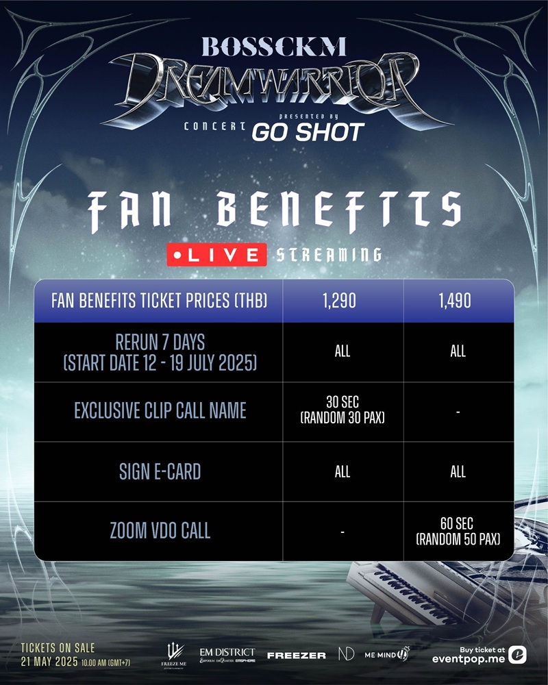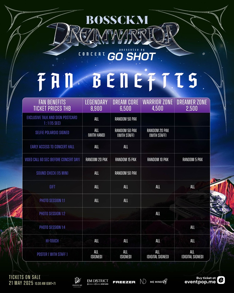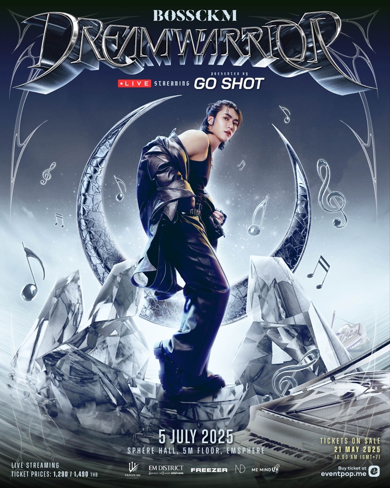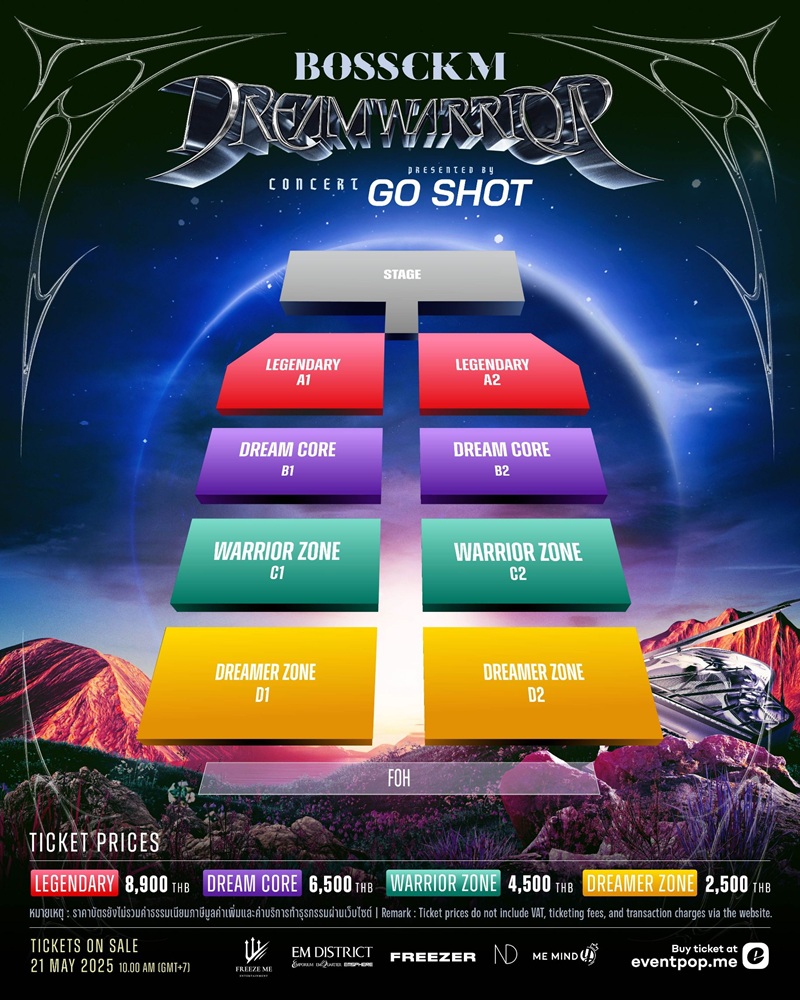 เริ่มจำหน่ายบัตรวันพุธที่ 21 พฤษภาคม 2568 นี้ เวลา 10.00 น. เป็นต้นไป ทาง https://www.eventpop.me/s/bossckmdreamwarrior บัตรราคา 8,900 บาท, 6,500 บาท, 4,500 บาท, 2,500 บาท และ Online Live Streaming ราคา 1,290 บาท, 1,490 บาท สามารถสอบถามรายละเอียดเพิ่มเติมต่างๆ ได้ทาง X: @Bossckmdreamwar