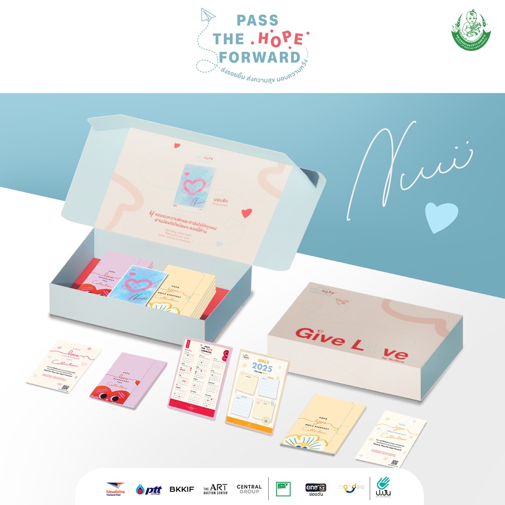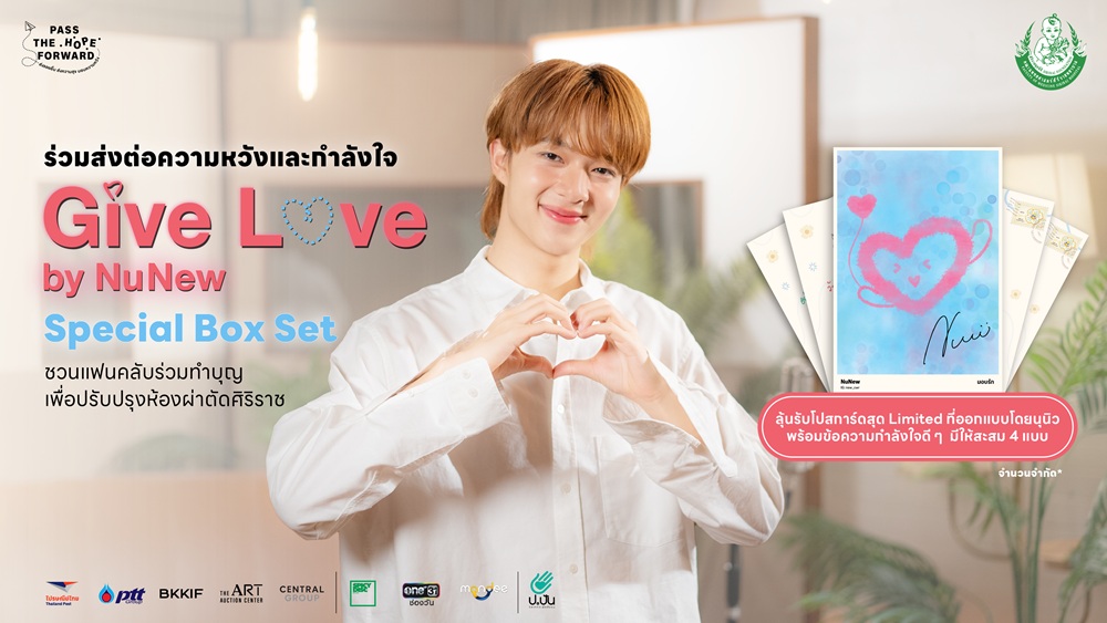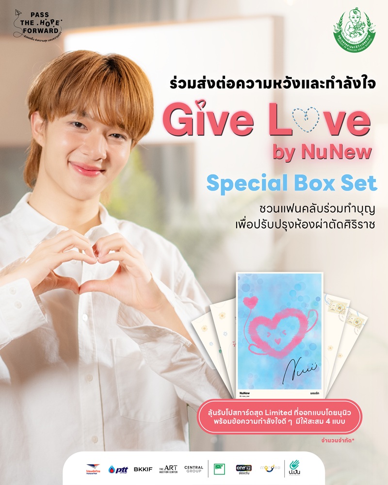 ร่วมส่งรอยยิ้ม ส่งความสุข มอบความหวัง #PassTheHopeForward ผ่าน “Give Love by NuNew” Special Box Set จากนุนิว ชวรินทร์ ในราคา 1,500 บาท *ไม่สามารถนำไปลดหย่อนภาษีได้ โดยรายได้ทั้งหมดหลังหักค่าใช้จ่ายจะนำไปสมทบกองทุนห้องผ่าตัดศิริราช ชั้น 3-5 ตึกสยามินทร์ โรงพยาบาลศิริราช เริ่มจำหน่ายตั้งแต่วันที่ 20 พฤษภาคม – 20 มิถุนายน 2568 ผ่านช่องทาง LINE OA : @PPUNSE หรือ https://lin.ee/MEovwwP (เริ่มจัดส่งสินค้าวันที่ 2 มิถุนายน 2568 เป็นต้นไป)