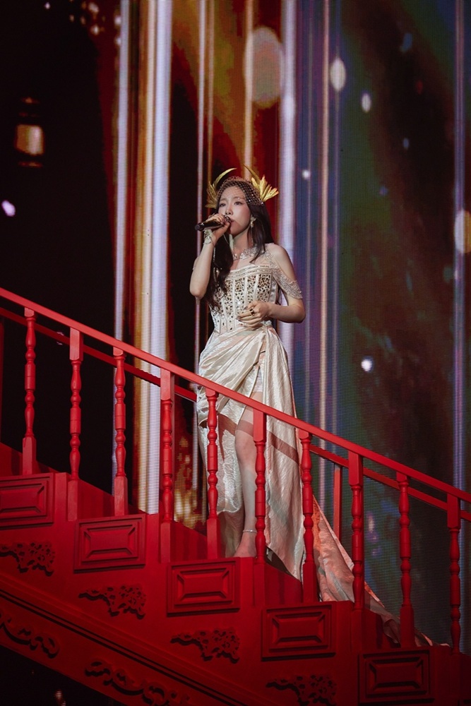 The most impactful scene was when TAEYEON stood radiantly on an elevated stage at the center of a pair of giant metallic wings that dramatically descended in ‘INVU’, creating a breathtaking spectacle — further enhanced by a projector casting images and shadows onto a translucent curtain over 13 meters long. In addition, her exceptional vocal technique was further highlighted through a seamless musical arrangement that sustained the emotional flow across songs: ‘월식 (My Tragedy)’ delivered a powerful wave of sorrow through her commanding vocals; ‘Melt Away’ melted hearts with unique vocal nuances; ‘To. X’ conveyed a chilling, poignant tone; and ‘What Do I Call You’ left a lasting impression with her continuous, sustained singing, accompanied by a set of picture frames slowly descending onto the center of the stage.