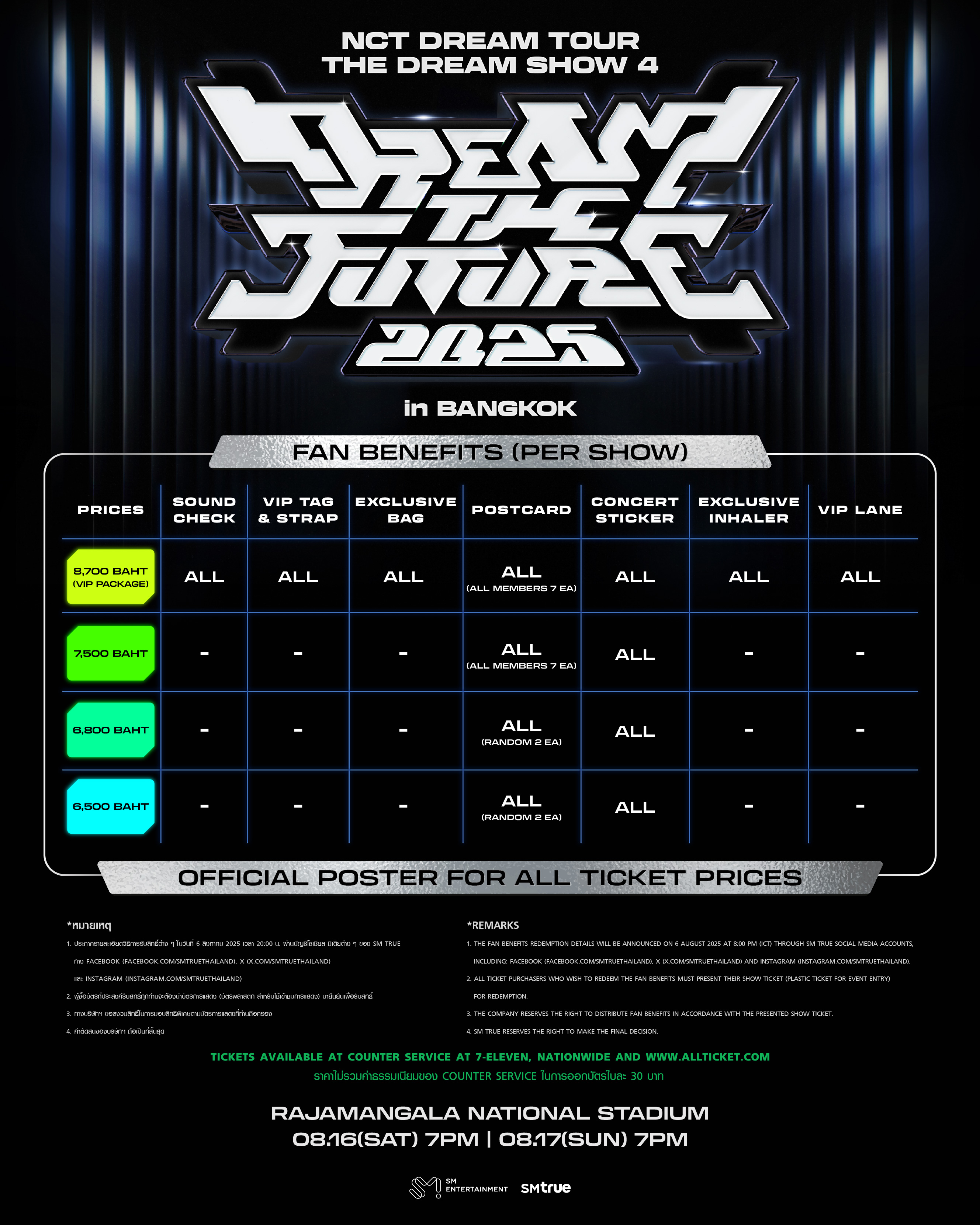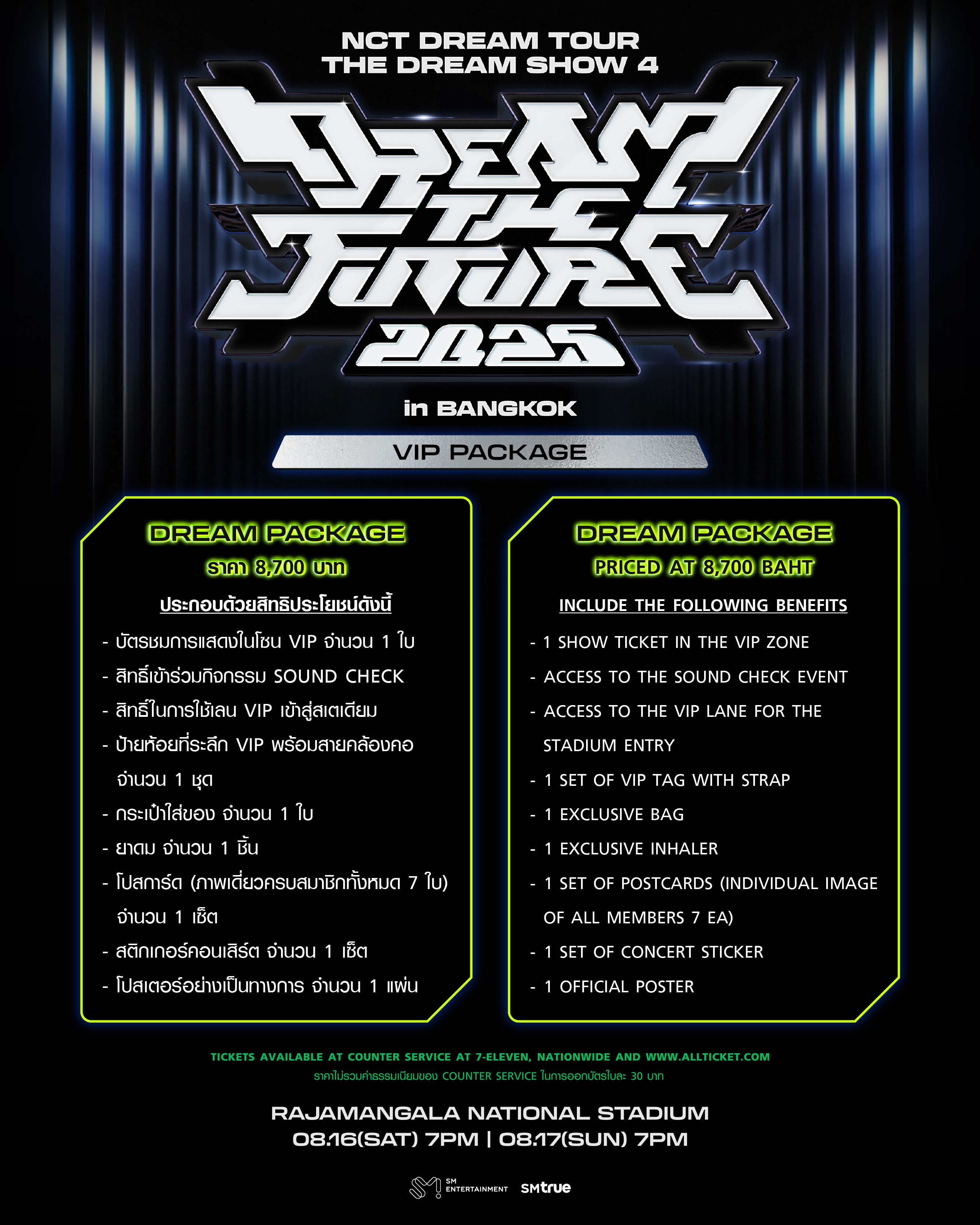 SM True (เอสเอ็ม ทรู) พาทุกคนเดินทางข้ามกาล-อวกาศ เพื่อร่วมฝันถึงทุกช่วงเวลาสำคัญของวงเค-ป็อปแห่งยุค NCT DREAM (เอ็นซีที ดรีม) พร้อมตอกย้ำประวัติศาสตร์ความสำเร็จใน 2025 NCT DREAM TOUR <THE DREAM SHOW 4 : DREAM THE FUTURE> in BANGKOK (ทูเธาซันด์ทเวนตี้ไฟว์ เอ็นซีที ดรีม ทัวร์ <เดอะ ดรีม โชว์ 4 : ดรีม เดอะ ฟิวเจอร์> อิน แบงค็อก) ณ สเตเดียมที่ใหญ่ที่สุดในประเทศไทย ‘ราชมังคลากีฬาสถาน’ ทั้งหมด 2 รอบการแสดง ในวันเสาร์ที่ 16 และวันอาทิตย์ที่ 17 สิงหาคม 2025 เวลา 19:00 น.