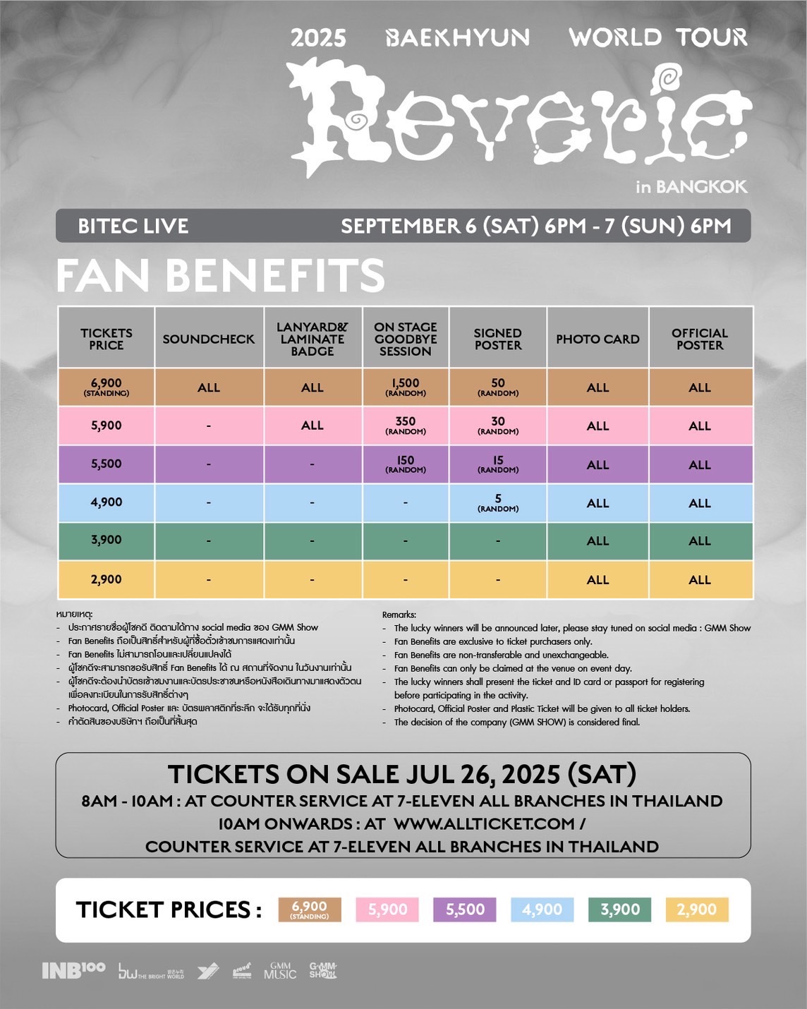 ราคาบัตร : 6,900 (บัตรยืน) / 5,900 / 5,500 / 4,900 / 3,900 / 2,900 บาท
