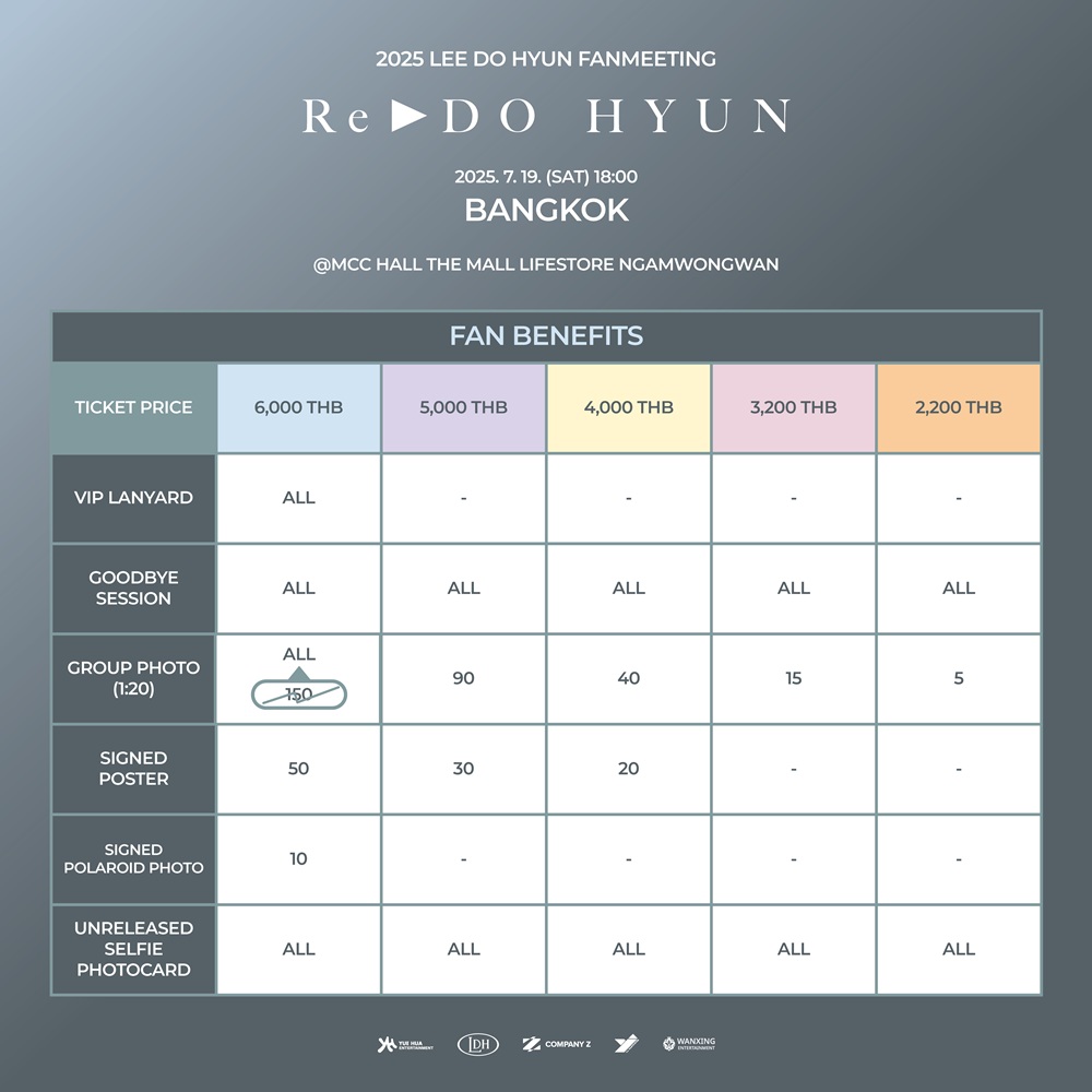 พี่พระเอกคัมแบ็คปังขนาดนี้ แฟนสาวสาขาไทยแลนด์ต้องไม่พลาด มาสบตากับรอยยิ้มเพชฌฆาตให้อิ่มใจกันเถอะ ในงาน LEE DO HYUN FANMEETING [Re DO HYUN] IN BANGKOK ใครยังไม่มีบัตร รีบจับจอง กับบัตรราคา 2,200 / 3,200 / 4,000 / 5,000 / 6,000 ที่มาพร้อมสิทธิพิเศษมากมาย