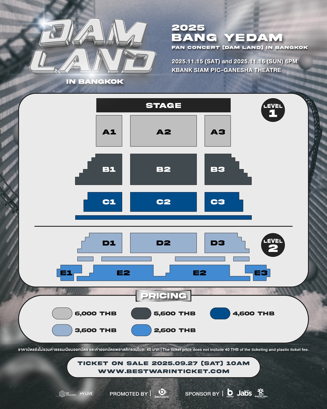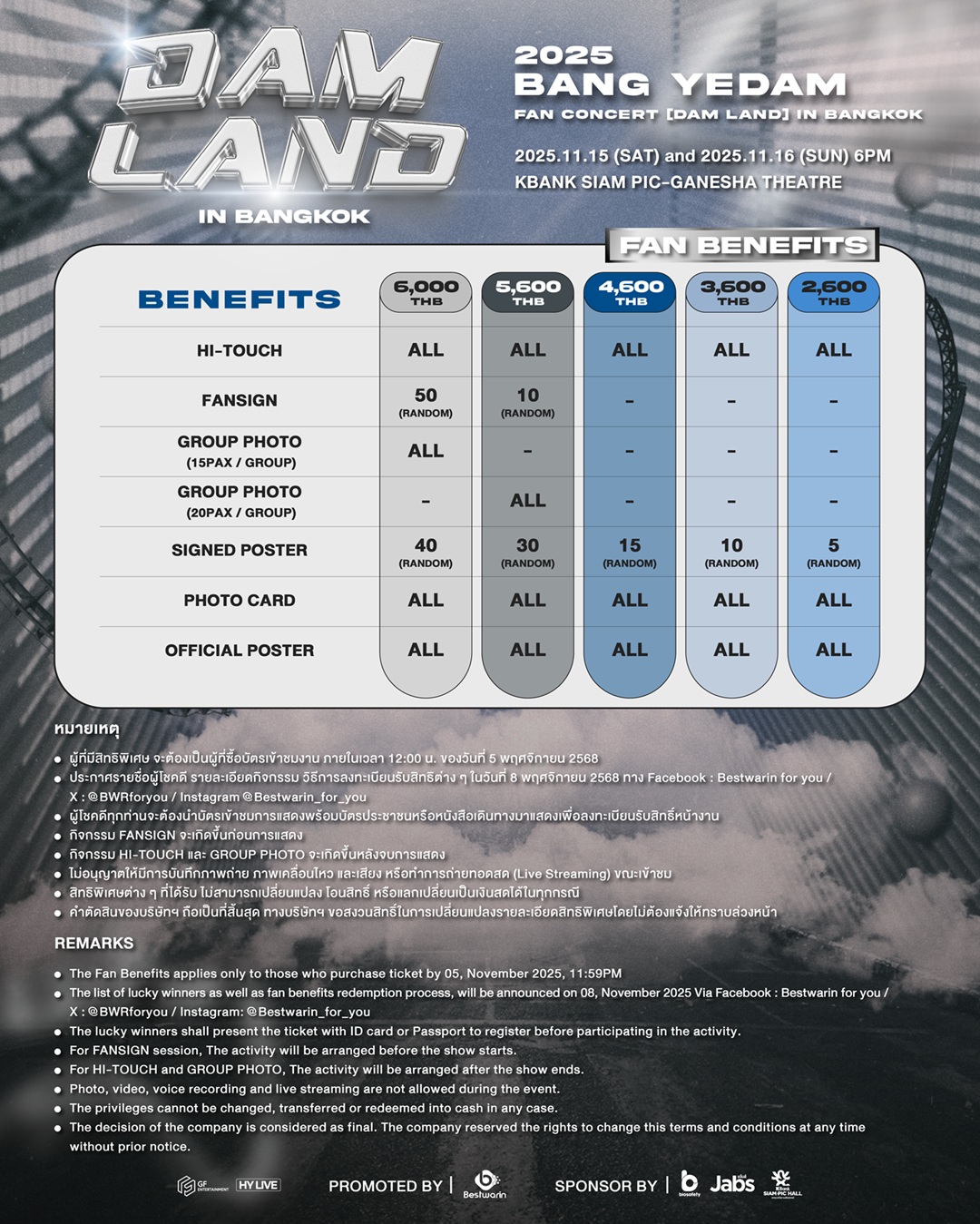 2025 BANG YEDAM FAN CONCERT [DAM LAND] IN BANGKOK จะจัดขึ้นในวันเสาร์ที่ 15 – 16 พฤศจิกายน 2568 เวลา 18:00 น. ณ โรงละครเคแบงก์ สยามพิฆเนศ เตรียมวอร์มนิ้วของทุกคนให้ดี เติมเน็ตให้เต็มสปีด มาจับจองบัตรในเสาร์ที่ 27กันยายน 2568 บัตรราคา 6,000 / 5,600 / 4,600 / 3,600 / 2,600 บาท เปิดจำหน่ายบัตรทาง https://bestwarinticket.com และงานนี้พี่เบสจัดให้ HI-TOUCH ทุกที่นั่ง