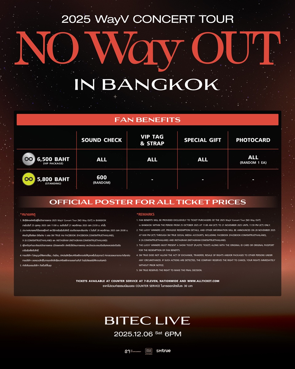 โลกดนตรีที่เต็มไปด้วยบทเพลงและการแสดงอันเป็นเอกลักษณ์ของ WayV (เวย์วี) จะทำให้ทุกช่วงเวลาเป็น “ไฮไลต์” ที่คุณไม่มีทางออกจากเส้นทางนี้ได้อีกต่อไป ! เปิดจำหน่ายบัตรรอบสมาชิก “WayZenNi” Membership (GL) Pre-Sale ในวันเสาร์ที่ 25 ตุลาคม 2025 เวลา 11:00 น. – 22:59 น., รอบสมาชิก JOY CLUB Pre-Sale ในวันอาทิตย์ที่ 26 ตุลาคม 2025 เวลา 11:00 น. – 15:59 น. เท่านั้น และรอบบุคคลทั่วไป ในวันจันทร์ที่ 27 ตุลาคม 2025 เวลา 19:00 น. เป็นต้นไป ทางเคาน์เตอร์เซอร์วิสในร้าน 7-Eleven ทุกสาขาทั่วประเทศ และทางเว็บไซต์ www.allticket.com/event/WayV_NOWayOUT_BANGKOK บัตรราคา 6,500 (VIP PACKAGE) / 5,800 (บัตรยืน) / 5,500 / 4,900 / 4,500 / 3,800 / 2,600 บาท พร้อมสิทธิพิเศษสำหรับผู้ซื้อบัตร ติดตามข่าวสารและรายละเอียดเพิ่มเติมได้ทางบัญชีโซเชียลมีเดียต่าง ๆ ของ SM True : Facebook (เฟซบุ๊ก) facebook.com/smtruethailand, Instagram (อินสตาแกรม) instagram.com/smtruethailand, X (เอ็กซ์) x.com/SMTrueThailand และ TikTok (ติ๊กต๊อก) tiktok.com/@smtruethailand สอบถามข้อมูลเพิ่มเติมเกี่ยวกับการซื้อบัตรได้ทาง Counter Service : อีเมล support@allticket.com และไลน์ออฟฟิเชียล @counterservice