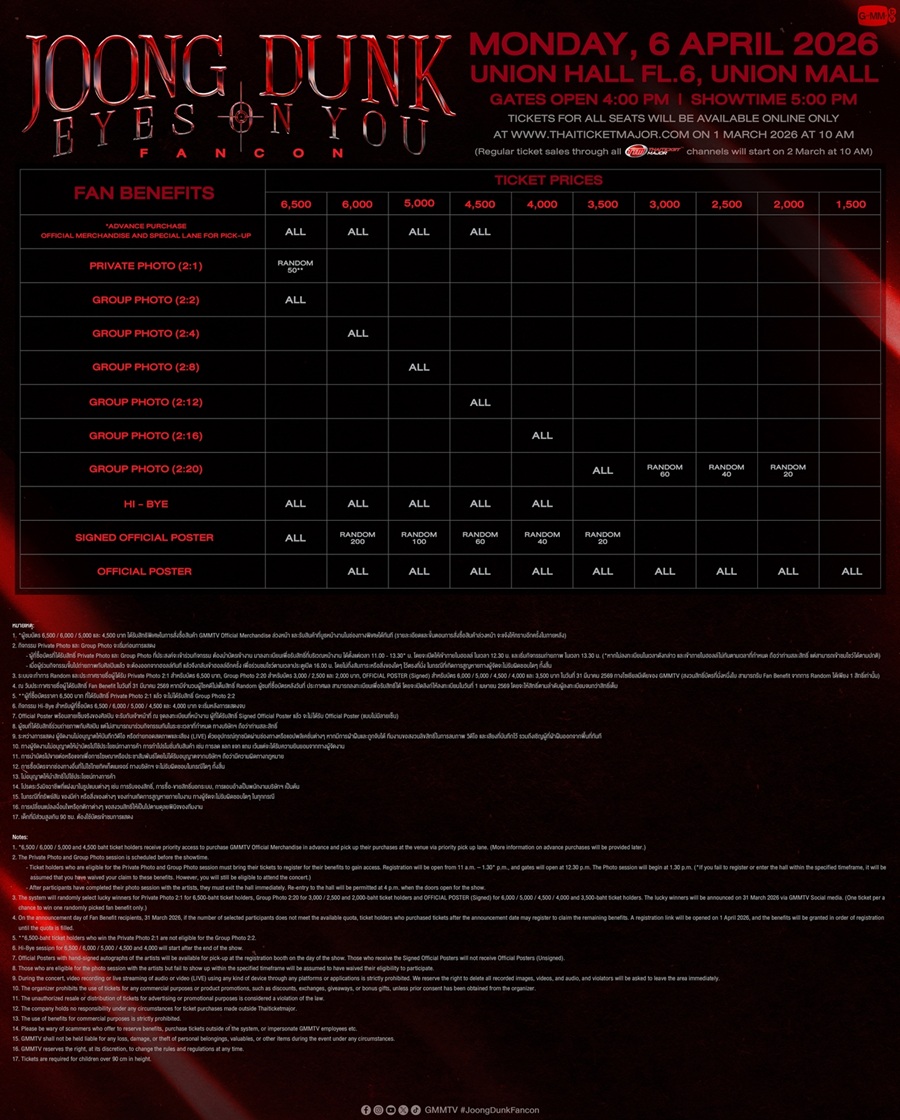 สำหรับผู้สนใจสามารถจับจองบัตรงาน “JOONG DUNK EYES ON YOU FANCON”บนช่องทางออนไลน์ ในวันอาทิตย์ที่ 1 มีนาคมนี้ เริ่มเวลา 10.00 น. เป็นต้นไป เปิดจำหน่ายทุกที่นั่ง ทางออนไลน์ที่ www.thaiticketmajor.com เท่านั้น และ เปิดจำหน่ายบัตร ทุกช่องทางตามปกติในวันจันทร์ที่ 2 มีนาคม 2569 เริ่มเวลา 10.00 น. เป็นต้นไป ทางไทยทิคเก็ตเมเจอร์ทุกสาขา, www.thaiticketmajor.com และ Call center โทร 0-2262-3456 โดยบัตรราคา 6,500 / 6,000 / 5,000 / 4,500 / 4,000 / 3,500 / 3,000 / 2,500 / 2,000 / 1,500 บาท และดูสดผ่าน TTM LIVE บัตรราคา 1,500 / 1,200 บาท (ลิ้งค์และโค้ดรับชม) (กรณีต้องการรับบัตรพลาสติกที่ระลึก ชำระเพิ่ม 30/ใบ) หรือติดตามรายละเอียดเพิ่มเติมได้ที่ www.thaiticketmajor.com หรือ www.facebook.com/gmmtvofficial & Instagram & X & TikTok & YouTube & Weibo : GMMTV