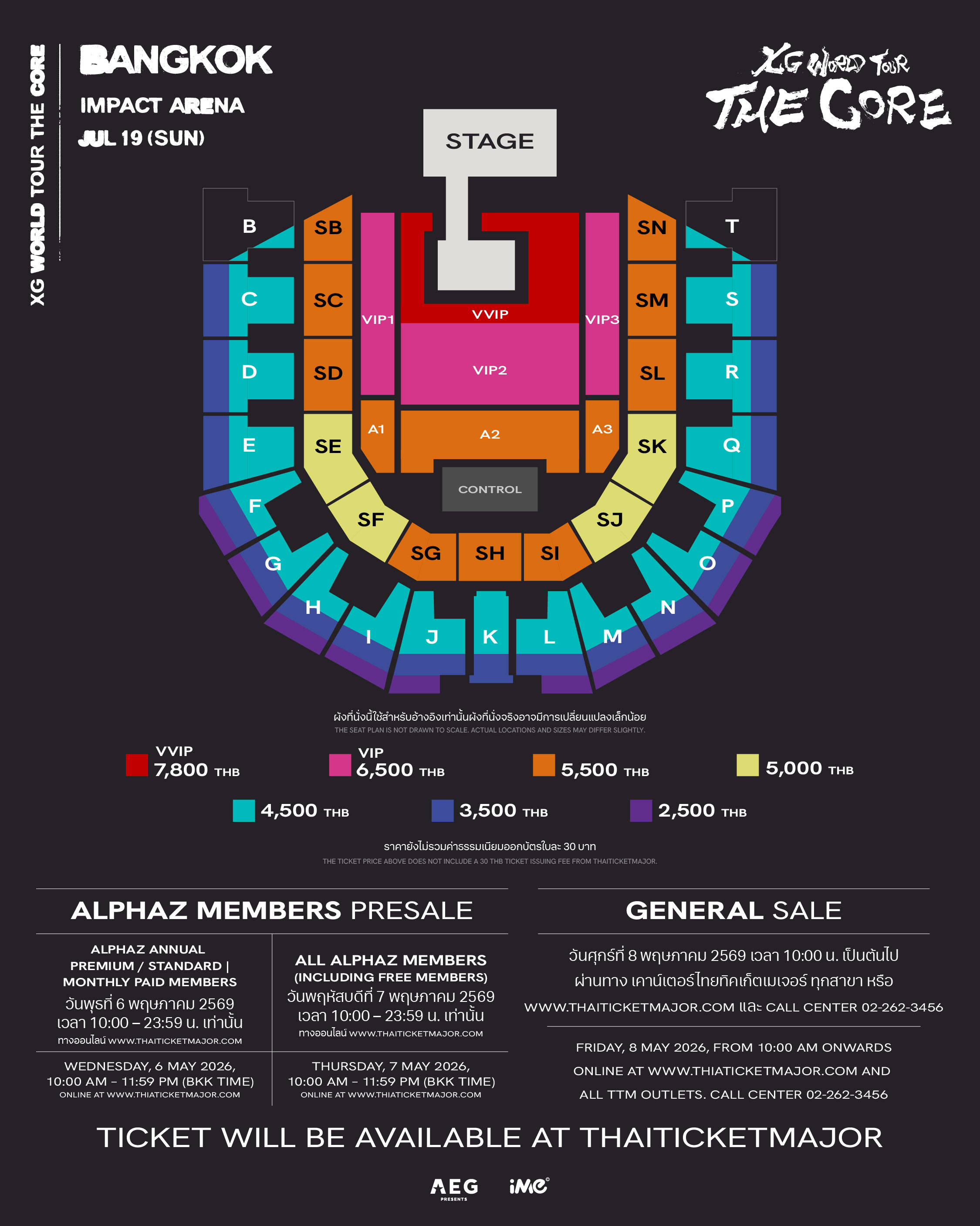 ผู้จัด “เออีจี พรีเซ้นต์ เอเชีย” (AEG Presents Asia) ร่วมกับ “ไอมี่ไทยแลนด์” (iMe Thailand) พร้อมแล้วที่จะพา ALPHAZ ชาวไทยเข้าสู่ใจกลางจักรวาลของ XG ในงาน XG WORLD TOUR: THE CORE IN BANGKOK ซึ่งจะจัดขึ้นในวันอาทิตย์ที่ 19 กรกฎาคม 2569 เวลา 19.00 น. ณ อิมแพ็ค อารีน่า เมืองทองธานี